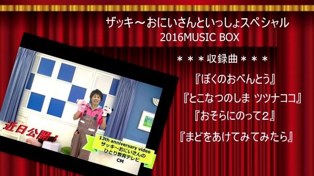 ザッキ~おにいさん13周年記念動画『クリスマスのおくりもの』のMUSIC MENUが決定しましたこれまでのお風呂場撮影ではなくとってもキュートな都内のスタジオ撮りしかも ザッキ~おにいさんがこんな事をやりたかった、って言う教育テレビのあんなコーナー、特別な思い入れのあるオリジナルソングをた~っぷり織り交ぜ OPEN LIVE風に演出もしかすると・・先代マスコットの ぶーたろうやモンチの登場もあるかもー♪これはこの前まで ママといっしょに 子育てサロンに訪問してた君へのおにいさんからの 贈り物そして長く長く ザッキ~おにいさんステージを支えてくれた保育園の先生、歴代ママへの感謝の気持ちをこめたアニバーサリー動画です('◇')ゞ◆果たしてどれくらいの時間でおさめられるか?現時点でお答えする事は出来ないのですが(^_^;)編集の関係で動画公開が来年に延びてしまう事もあるかも知れませんがどうぞ気長にお待ちください。なお2016/11/30までに「ザッキ~さんたが行くクリスマス2016」ステージをご予約下さった団体さんには後日サプライズで上記のLIVE動画をプレゼントしたいと考えてます。追って詳細をお送りいたしますので 楽しみにお待ちください(^_-)-☆