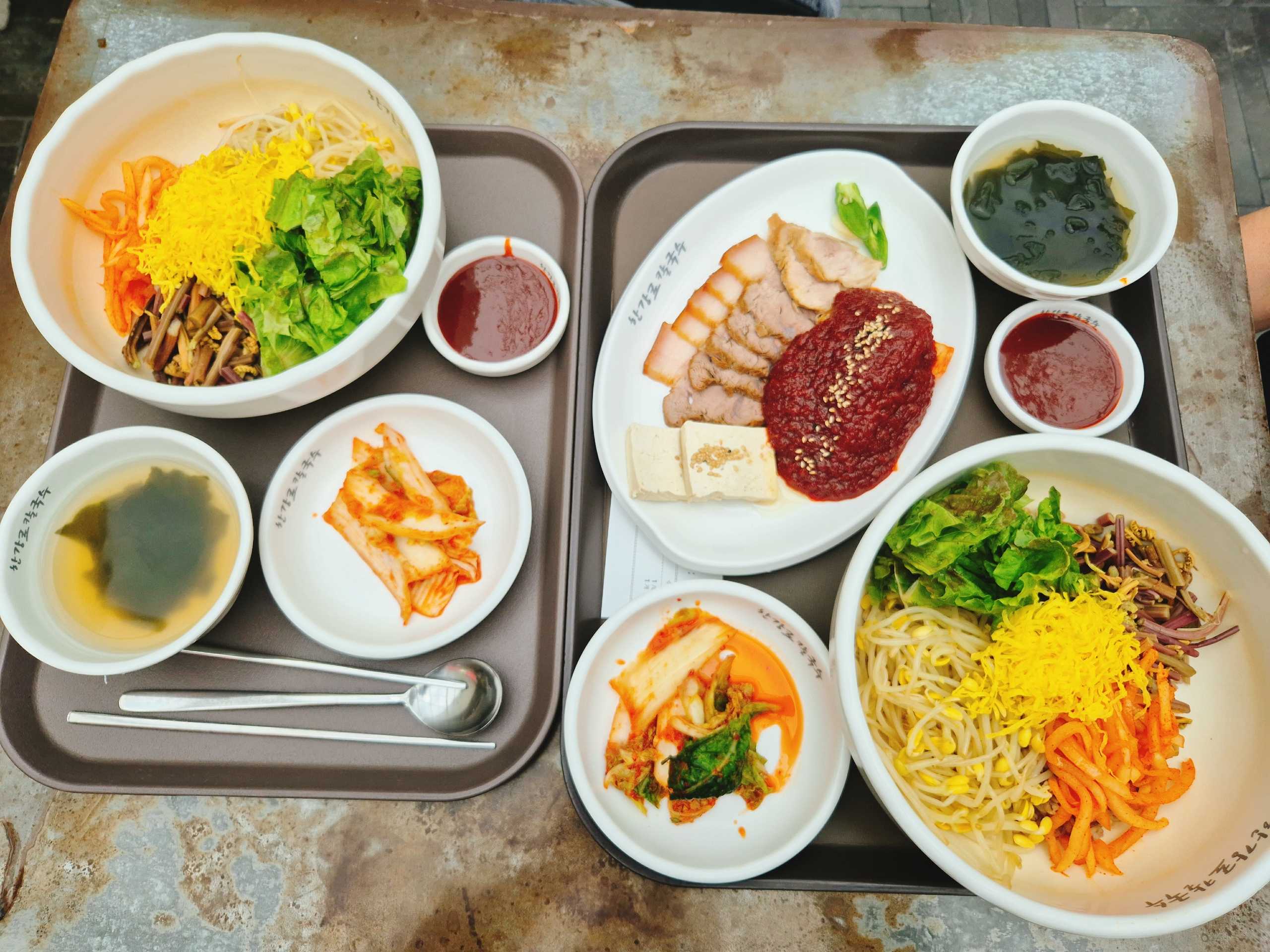 夫婦で、食べ物の好みが違ったり、食べる量や速度が違ったり、いろいろ違って、しかもそれは年を取れば取るほど合わせにくくなりませんか?よそのお宅ではどうしているのでしょう?はんらとノギさんも食べ物の好みがかなり違い、それは、バイキングに行くと顕著に現れる。同じバイキングに行ったのに、取って来るものがほとんど被らない。お昼を外で・・・という時も、はんらは、ハンバーガーやサンドイッチなどでも大丈夫、というか、そういうものの方が好き。でもノギさんは「それは間食で食事じゃない」と言う。でも、食事した後に、ハンバーガーやサンドイッチなんて入らないじゃん?ノギさんが主張する、お粥類ソルロンタン類は、はんらはなるべく避けたい。お粥なんて、病気の時でしょう・・・麺類も、イマイチ・・・若い頃は、なるべく合わせて食べていたけれど、もう、おいしいものがおいしく食べられる人生がだんだん短くなってくると、大事な1回の食事に、あまり好きでもないものなんて食べたくないのよ。ノギさんが資格試験の勉強の本を買いに行くのに同行して新世界デパートに行った。ここは、フードコートがあるので、どこの食堂に入ろうか?と揉めることもなく、各自、好きなものが選べていいのだ。ノギさんが、「カルグクス(韓国風麺)はどう?」なんて聞いてきた。「各自、好きなものを食べよう。私は麺類はあまり好きじゃないからね。ビビンバか何かにするよ」とはんらが言うと、「じゃあ、この麦ビビンバと、麦ビビンバ+茹で豚セットを1つずつ注文して、茹で豚は半分こしよう」とノギさん。OK、それで手を打つわ。全部で27000ウォン(約2850円)。お肉+豆腐は半分こ。ノギさんはあっという間に食べてしまい「本屋で本を見てるよ」と行ってしまった。ノギさんはホントに食べるのが早い。よしくんなんかは、ゆーーーっくり食べるのではんらと速度が合うんだけど。ノギさんと一緒に食べに行くとあっという間に食べてしまって待ってるので、なんか、嫌。家でご飯を食べる時も、一人であっという間に食べ終わって、ブドウなんかを洗いに行って、自分だけ先に、デザートタイムに入っている。なんか、嫌。