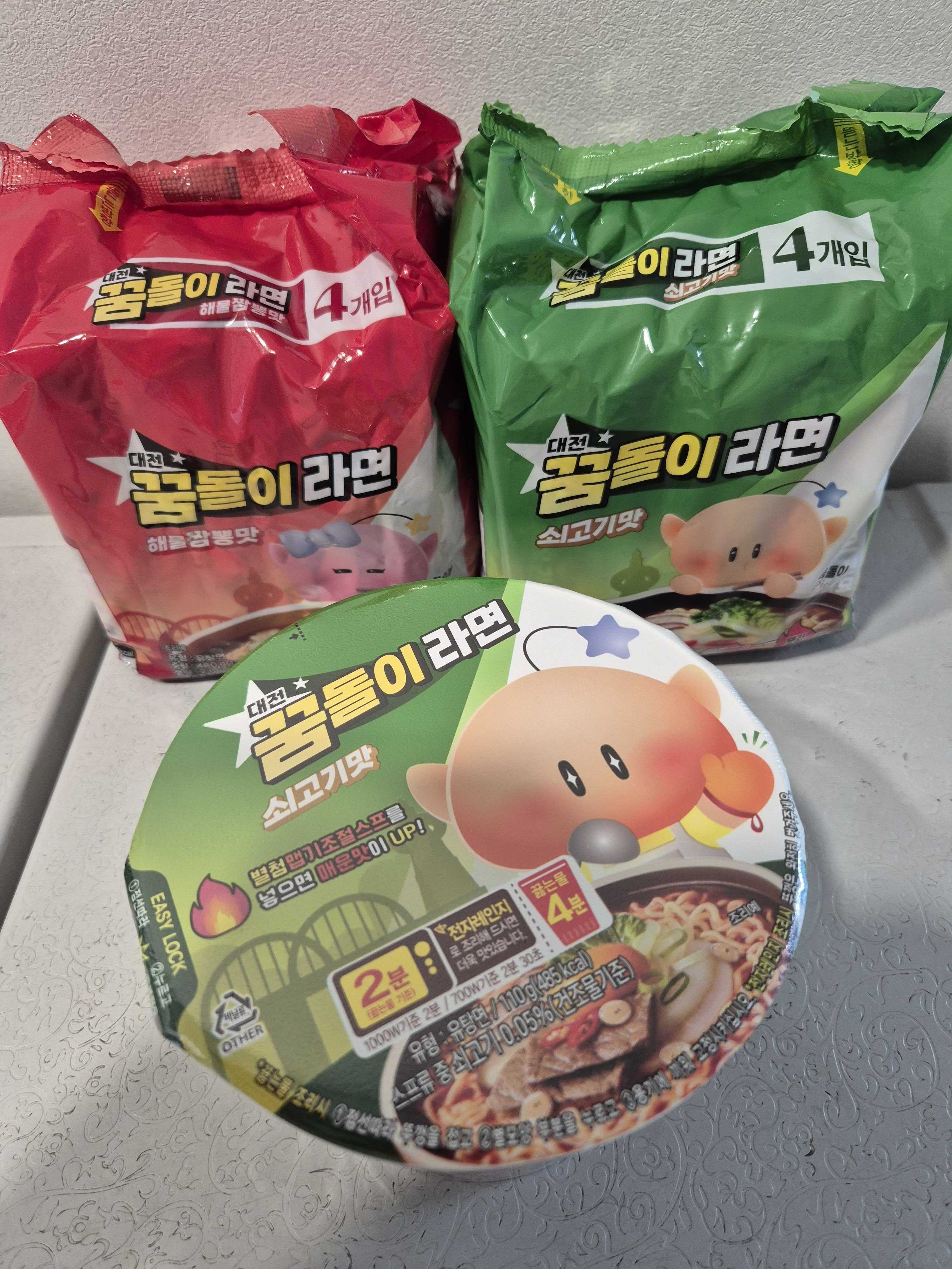 クムドリというのは、1993年に開催された、大田国際博覧会(←クリック)のマスコットの名前。大田市には、聖心堂(ソンシムダン)という全国区で有名なパン屋がある。反対に、大田市には、聖心堂以外には何もない、とも言われている。聖心堂は全国区で有名だが、決して、大田市以外に進出しようとはしない。これはとても賢明なことだと思う。韓国は日本のように、各地域の特産品というものがほとんどない。人気が出るとすぐに、ソウルを始め、他の地域に進出してしまうからだ。ここ、天安市の特産品は「くるみ菓子」なんだけど、「天安くるみ菓子」は全国、どこに行っても売っている。ソウルの知人に会いに行くのに、天安でくるみ菓子を買って行っても、ソウルに到着してみるとそこでも「天安くるみ菓子」を売ってるのだ。大邱発祥の有名なパン屋「三松(サムソン)パン屋」もソウルを始め全国あちこちに店舗がある。1945年に開業した韓国最古のパン屋として有名な全羅北道の群山市発祥のパン屋「李盛堂(イソンダン)」もあちこちにある。聖心堂(ソンシムダン)だけは、大田に行かないと買えない。先日、大田に行ったよしくんが、「このラーメンも、大田でしか売ってないんだ」と買って来たのが、大田クムドリ ラーメン!大田以外のところでは売らないんだそう。赤いパッケージは「シーフードちゃんぽん味」緑のパッケージは「牛肉味」製造会社はオットゥギ。よしくんがラーメンを茹でてくれた。真ん中にいるクムドリが見えますか~?笑。手前の取り皿は、天安シティFCのグッズ。「ちゃんぽん味」だけど、ほとんど辛くない。フツーのラーメンだった。