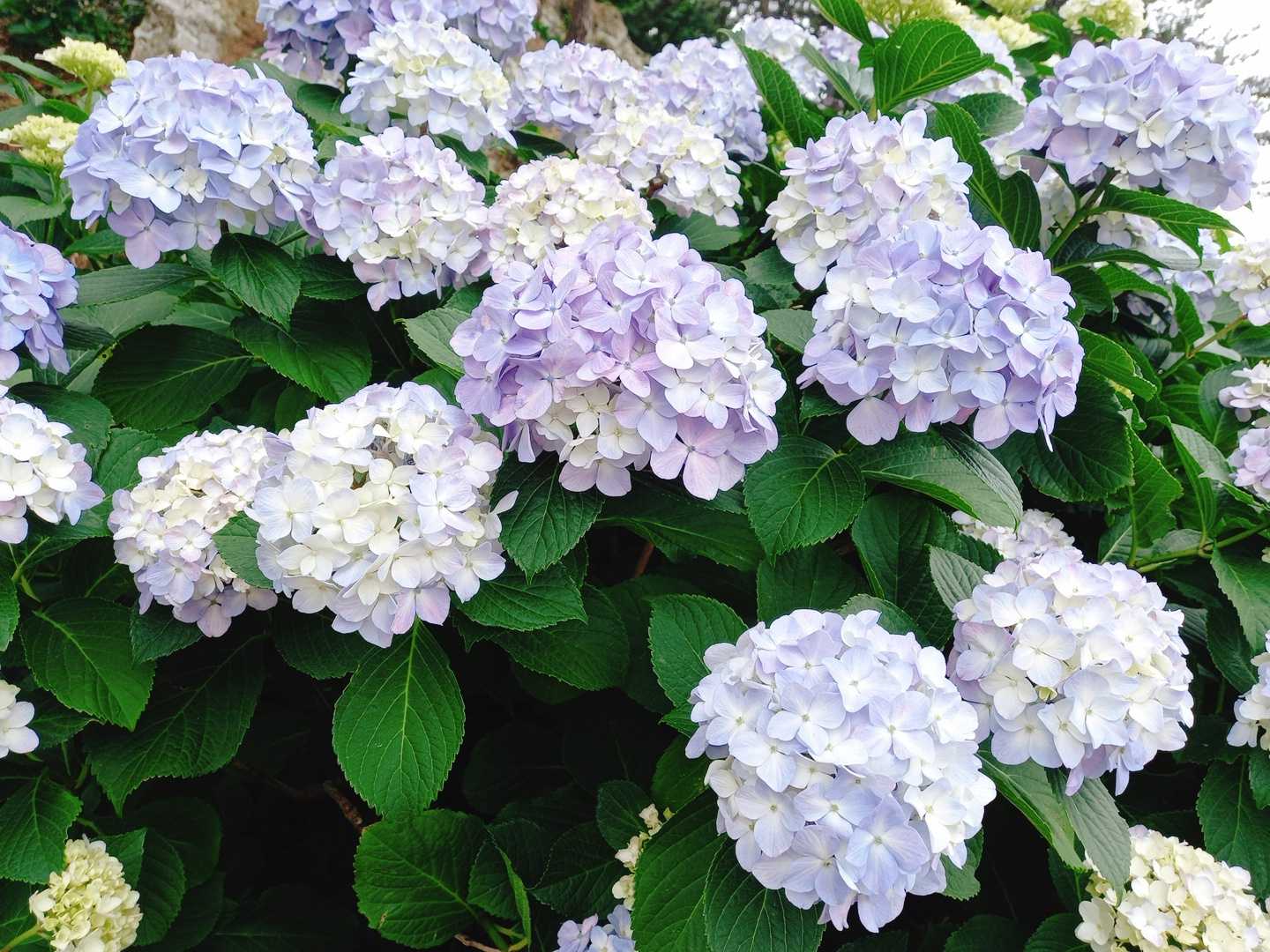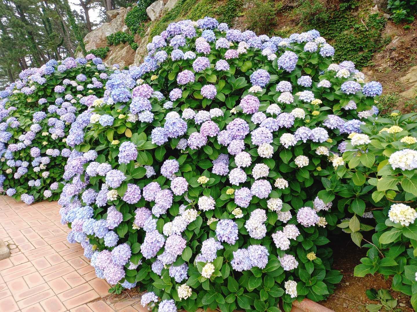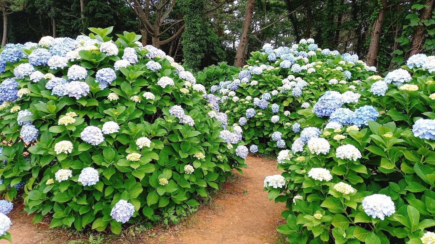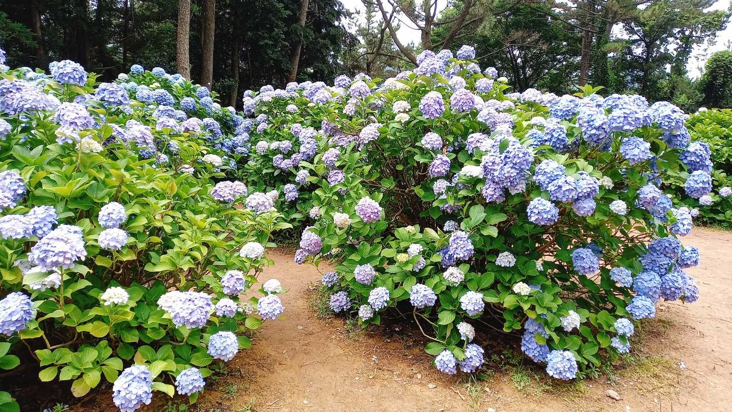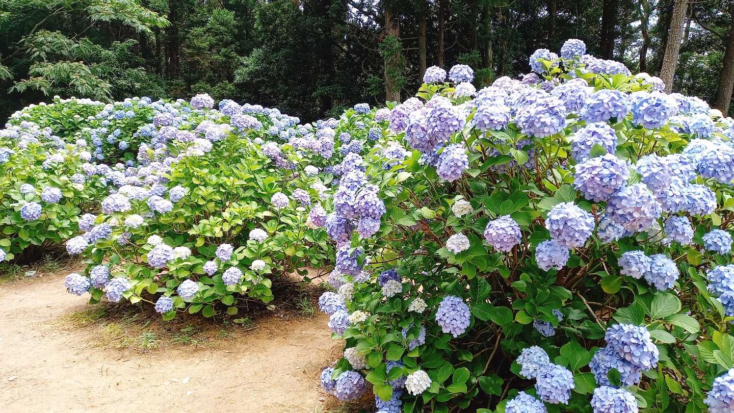 道に沿って、デカめの紫陽花がズラーっと植えられている。
