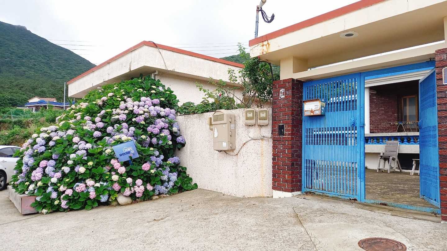 青い門の家の向かい側の家にも紫陽花が咲いていた。