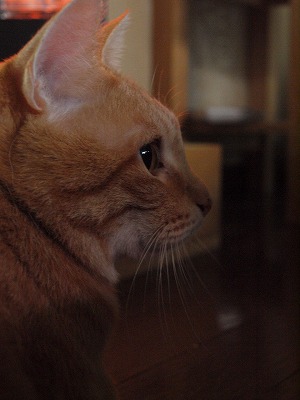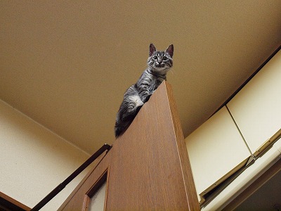 いやはや。。。すごい運動神経です。。。^^; ドアの上に乗ってますよ~台所の流しからジャンプして、勢いでドアを閉める事無く飛び乗る。。。ジャンプ力も運動神経も、すでに先輩猫達を越えているカノン。この位置から、台所の上の棚までジャンプ。棚の中には猫のゴハンが置いてあるので注意が必要です。器用というか。。。困った子というか。。。^^;;まぁ、棚は閉じてしまえば入れないのでいいのですが、一番困ることはと言うと。。。「人間のぼり」かしら?画像はないので、文章で説明すると。。「人間のぼり」とは、「木登り」だと思ってください。。。ひゃ~足元から肩まで、スゴイ速さで登ってくるんです。爪痕を感じながら 「ぎゃー!」って言う頃には、横にカノンがいます。。(T-T) これって。。子猫のうちだけの行為ですよね。。?大人になったら。。やらないよね?大人になってもやったら。。今は、それが一番の心配です。^^;やだよ~
