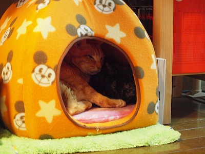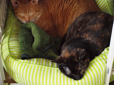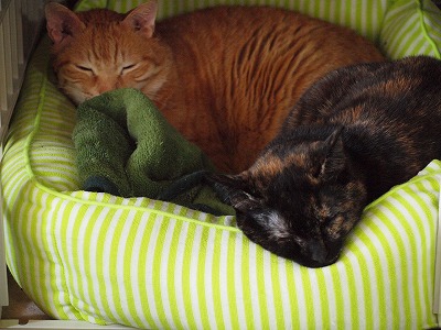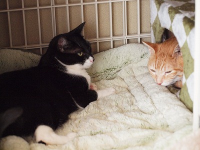 カノンと折り合いの悪かったナジャ。まだ小さかったカノンにパンチに威嚇攻撃の日々。当時はカノンの里親探しも視野に入れていたぐらい、仲が悪くて・・でも、2ヶ月もしたら変化が起こり、 今では仲良く一緒に寝るようになりました^^喧嘩ばかりしていたのに、、こうして一緒にいる姿を見てると。。。なんとなく、嬉しいね^^