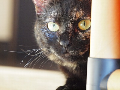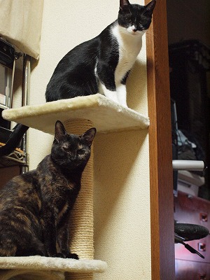 三段ケージの上でカノンとボンが一緒に怯えている。掃除機が恐い。寄り添って、恐がっている姿が可愛いので。。つい写真撮ってしまいました^^;ナジャも掃除機恐いさん。タワーの上で避難です。上手く撮れなかったけど、ナジャは恐がると全身の毛が逆立ち、黒いマリモみたいになります(笑)みんな掃除機が恐いのに。。。平気な顔をしているのがお京ちゃん^^:寝てるし・・・ 掃除機で追いかけたりしていないのに、そんなに恐がるなよ~いいかげん、馴れて欲しいものです。まぁ、怯えた顔も可愛いんですけどね(笑)