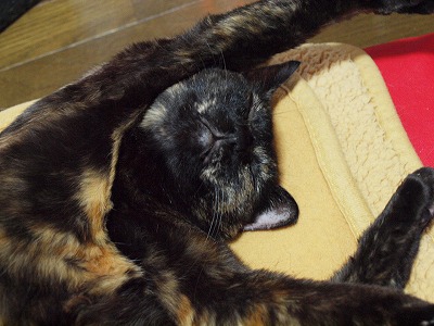 ヒーターの前で寝ているお京ちゃん。。。もう。。かれこれ3時間ほど、この体勢。。。^^;;寝返りもしない。。。ひたすら忘却の彼方に身を置いている。。。 こんなお京ちゃんが安心するのか?よく、カノンはお京ちゃんのそばにいることが多い。でも。。 さすがに。。 「 よく寝るな~ 」と、カノンは思っているに違いない。しかし、動かないな・・・本当は死んでるんじゃないのか?。。。(笑)