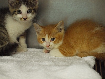 愛らしさ抜群の茶トラのいっちゃん(♂)大物の予感の白黒さんちゃん(♂)飼い主さんが決まりました^^いっちゃんを引き取られる飼い主さんは最近、愛猫を亡くされました。もう、猫は飼わない・・・そんな悲しみを抱いておられましたが、いっちゃんの愛らしさに負け、再び猫を飼う事に^^ さんちゃんも優しい飼い主さんのもとへ。私の向けたカメラを恐がらなかったさんちゃん。君が一番写真撮りやすかったよ(笑) 幸せになってね。 ご声援有難うございました。 残るは、にーちゃんです。↓優しい毛色の女の子です^^宜しくお願いいたします。