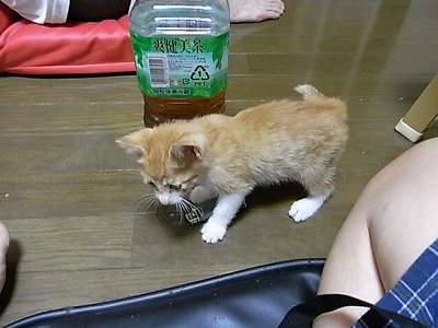 子猫が我が家にやって来てから。。。他の子たちの反応を観察。ちょっとビックリしただけで、カノンの時のような異様な殺気はなくひとまず、安心^^かと、思いきや。。。。次の日から、お京ちゃんが監視塔へ上ってしまった。。。スナイパーお京になって殺気立っています^^;うーん。困ったね。お京ちゃんは、ちょっと神経質なタイプなのかもしれない。すぐに、他の子と打ち解ける性格ではないようです。カノンはちょっとビックリして、最初は威嚇してましたがまだ、若いせいか すぐに子猫に興味を持ち始めました^^なんだか、とっても気になるようです。子猫の方も友好的で、近寄りすぎてカノンにパンチ★されてもへっちゃら。仲良しモード全開です(笑)カノンも、ナジャと同じで早くに仲良くなれそうです。そして、この子猫が一番最初になついたのは。。。。やはり、この猫。。。ボンです^^なんで、ボンはこんなに子猫のハートをキャッチするのが上手いのかね~父性愛が旺盛なボンの存在はとても助かります^^いろいろと、面倒みてくれてありがとうね♪ボンがやってくると、きゃっきゃと喜ぶ子猫。同じ茶白なので、仲良くしてる姿は本当の親子のようです^^里親募集の準備中。。。残念なことに、ちょっと子猫の下痢が酷くなってしまいました。食欲はすごいあるし、元気もあるのに健康なウンチが出ません。どんな環境下で育ったのか分からないので、病院に連れて行って健康診断してもらおうと思います。里親探しは、それからだね。幸い、拾ってきた隣人の娘さんが治療費は全額負担すると言って下さっているのでとても助かっております。 やったー^^