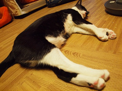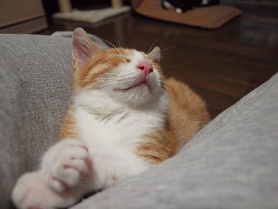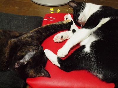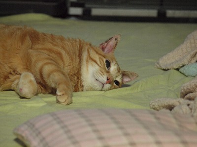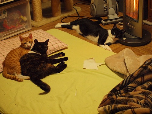 自宅輸液にしてから病院嫌いのボンは安心したようです。 ゆっくり自分の時間をすごし、よく寝ています。 しかし、やはりというか。。。ボンが大好きなちび助が睡眠の邪魔します^^;ナジャやカノンは、ボンの具合が悪いのは理解してるのですがちび助は、どうしてもボンに甘えたい・・・・^^;;具合悪いながらも、ちび助の相手をしてくれるボン。 なるべく一緒にしないように配慮してもなかなか難しいです。が、最近はボンのかわりにカノンがちび助の相手をしてくれるようになりました。 カノンとはなかなか相性が良いようで毎日追っかけこ、バトルの連続です^^ そして、ナジャを母のように慕っているらしくよく甘えています。ナジャの方もちび助をほっとけないようで可愛がっていますね^^ちび助を嫌っていたお京ちゃんも気が付いたら、一緒にネンネ。ちび助の さっぱりした性格にさすがのお京ちゃんも根負けしたらしい(笑)結局、みんなと仲良くなってしまった。。 いろいろ悩みましたが。。ちび助をうちの子にしようと思います。ははは^^;;また親に何か言われそうだわ(汗) というわけで、新しい家族になったちび助をよろしくね^^ そのうち大きな猫に成長するのでいつまでも「ちび助」ではいけませんね。。 さて、どんな名前にしようかな^^;