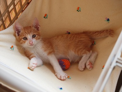 子猫の名前を考えることに。。一応、ちび助(仮名)と呼びます^^;ちび助~まくらカバーの角をハサミで切って穴を開け、ひもで吊るした、簡単なハンモック。もう大変なお気に入り^^ちゃんとしたベットも用意してるけど入るのはやっぱりハンモック。ちび助~ 気に入ってくれて私も嬉しいよ^^
