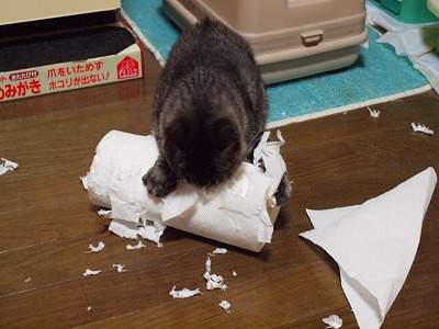 うひゃー!?また、やられちゃってるよー! 今度はキッチンペーパーかい!親の敵のようにペーパーを貪ってます。そんなに興奮するもんかねー(T-T)あのねー、この不景気の時代、キッチンペーパーは大事にしなければイカンのだよ。無駄使いはイカンのだよーちみー・・・ 。。。。って、聞いてねーし。(怒) 見かねた父ちゃんに捕獲されるカノン。。。。散らばったゴミを掃除すると、興奮して邪魔するカノン。。。。(T-T)うひゃー! こりゃ、久々のわんぱく猫ですわ^^;寝ている顔は天使なんですけどね。。。。