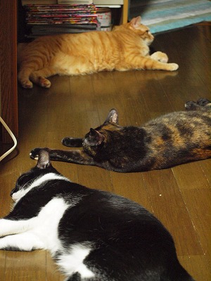 連日、記録的な暑さが続きますね~みなさん夏バテしてませんか?私の周りでは皆、食欲なくしてきています。この暑さじゃ無理ないですね~^^;私は食欲だけは、しっかりあるので^^;;夏バテには縁がないようです。嬉しいような悲しいような。。。我が家の猫達も。。私と同じように、食欲旺盛で夏バテせず、やんちゃに家の中を走り回り、元気いっぱいな毎日をすごしております。ご心配なく?(゜゜;)☆\(--;)スパコーン☆