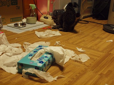 うひゃー! やられちゃってるよー(涙)子猫定番のティッシュ乱舞!炸裂です。。。何故。。ティッシュなんだ。。(T-T)あのねー・・・この不景気の時代。。ティッシュは大事にしなければいかんのだよ。。無駄使いはイカンのだよーちみー。。。 。。。。って全然聞いてませんね。カノン。。。(T-T) 一日に4回掃除しないといけないではないか。もう。。 掃除する身にもなってください。。。しくしく。。 暴れん坊の女の子ですが。。 寝ている顔は天使です。。。歯歯歯。。(´∀`;)
