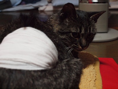 3日間何も食べなかったカノンですが、4日目には食べてくれるようになりました。・・・と、言っても カリカリ5グラムですが。。。^^;とても食べている内に入らない量。さすがに、本格的に心配してしまいます。しかし、5日目に20グラム程のカリカリを食べるようになり、6日目には30グラム。食欲がドンドン上がってきました。 いや~よかった よかった~(´∀`;)ナジャもカノンにパンチ★するようになったので、回復したと見て良いでしょう(笑)動きは弱いですが、歩き回るようになりました^^これで、やんちゃさが戻れば良いのですが。。。どうだろう?包帯を取ろうとしてるカノン。もうすでに、やんちゃが出てます。聞かん坊に戻るのに、そう時間はかかりそうにない気がしますね^^