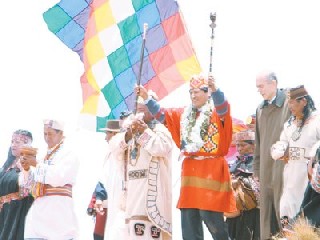 22日に就任する南米ボリビアのモラレス次期大統領(46)をたたえる先住民の儀式が21日、ボリビア西部の世界遺産「ティワナク遺跡」で執り行われた。メキシコやエクアドル、アルゼンチン、米国など米大陸12カ国の先住民代表ら約1万人が集まり、ボリビア初の先住民大統領の誕生を祝った。