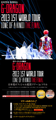 ★★G-DRAGON 2013 WORLD TOUR : ONE OF A KIND★★★G-DRAGON 2013 WORLD TOUR : ONE OF A KIND★2013/03/30!行きます・・・2013/03/31・・コンサートを見に行きます(*^_^*)幸せ.日本公演も2回見る予定。ソウルは日帰りではないですが、それに近い旅行。1時間半位で行かれるんですよ。本当に、日帰り出来る位。BIGBANG!!FROM YG★★最近はホームページ、日本語でも書かれてます。より、親近感が湧くかも~チケットも3階はまだ残ってます。VIPスタンディングが、購入出来たので行く気になりました。BIGBANG ALIVE GALAXY TOUR 2012 ‘THE FINAL’が、3階だったので少し寂しかったので~★★★G-DRAGON 2013 WORLD TOUR : ONE OF A KIND<Seoul>★★