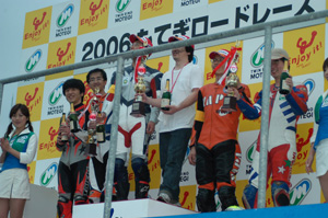 今日はもてロー第2戦。ヨコヤマ店長は、先日、貴公子さんが130Rで大破したK6を突貫工事で直して持ってきたが、予選が初走行。”ほんとにまっすぐ走るのか。。。”周りも本人も心配していたがそれは大丈夫!だったが。。。ステアリングダンパーに問題発覚!予選直前に急遽なおして出走!そして、そんなマシンで予選は3番手!しかし、残り2週くらいでいきなりエンジンストールしたらしい。電装系のトラブルらしく、一度キルスイッチを切れば復活するが。。。ぜんぜん原因がわからない。。。その後チェックしてみたらカプラーが一箇所外れかかっていた、との事。しかし、決勝前のウォームアップで同じように止まってしまい結局、ヨコヤマ店長はリタイヤ。 かわりに、好調をキープしているFFUさん。予選は4位、決勝3位!50歳とは思えない走り!そう考えるとまだまだ俺なんて子供だなぁ(^ヘ^;いろいろ見ていて凄く勉強になった!見習ってがんばるぞ! そして今日のメインイベントオープンマイスターでは、高橋、梨本、黒川の3つ巴のバトルは凄かった!57秒台と凄すぎるバトル!見てて怖いくらいの速さだった!でも、やっぱり速いとかっこいいなぁ!一度は1000ccのマシンに乗ってみたい。。。危なすぎるかな(^ヘ^;リタイヤを決断するのはやっぱり大変勇気がいるよね?