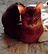 こんにちは~一回日記書いただけで放りっぱなしでスミマセン(汗)その間に来て下さっていた方々、有難うございます&すみませんでした。つまんない日記だけしかなくってblog初心者で何をどうしたものか、手探りで作っていってます。これから、食に関して私の思っていること・感じていること、ネットや実生活で得た情報などについて書いていこうと思っています。それと、あと、猫!うちのにゃんこのことも色々と親ばかするつもりです。どうぞよろしくです~さて。長い前置きはさておいてタイトルの「うちのにゃんこ」名前:オンサ 猫種;アビシニアン 年齢:8歳8ヶ月(末広がりでめでたいな/笑)男の子で去勢済み。一人っ子で育ったせいかおっとりしている。少し人見知りがあり逃げ腰ですが来客にも近寄っていくし、病院も嫌いだけど、診察の間唸っているけど、決して噛んだり引っかいたりしない。とっても食いしん坊。この間、麻婆豆腐を食べようとした時には焦りました。