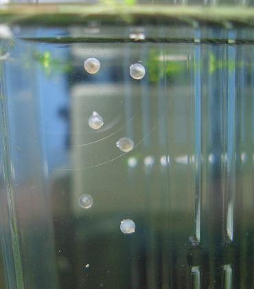 さて、昨日の日記の最後に予告めいたことを書きましたが、予想通りに新しい抱卵ビーさんがでました(*^^*)実は昨日ビー水槽で抱卵の舞があったんですょ♪ビーさんの抱卵の舞いは初めてでしたが、前にミナミさんを17cmキューブ水槽で単独飼育してたときに何度も見たので、動き方からまず間違いないと思っていたんです(^^)男の子ばかりが5・6匹くらい舞ってました~同居中のボララスさんはそれを邪魔するどころか、自らはしっこに避けてます(´∇`)で、お相手の女の子は逃げもせずに、水面近くまで生長したラージパールの葉っぱに捕まっていました。すでに一匹の男の子が狙ってます(´∇`)(笑ラージパールは気泡をつけて調子良さそうですが、下のほうは黒髭ゴケが繁殖してますね(汗うちのビーさんはまだ若い子もいるので、舞ってた数が少なくて、写真に撮るとちゃんと舞ってるのが2・3匹しか写せませんでした。まぁ、抱卵の舞を見れて写真に取れただけでもましかな♪で、本日帰宅後に水槽を見てみると・・・いました、昨日の女の子がwお腹にはなみなみと黒っぽい卵を抱いてます♪無事に産まれてきてくっることを祈るばかりです(*^^*)先日生まれた稚ビーも元気です(^^)今日はラージパールの葉っぱに乗ってましたwちょっと枯れかけたあまり綺麗じゃないラージパールですが・・・もしかして食べてるのかな?(汗そろそろ右手のリシアマットが浮きそうです(汗まぁ、リシアネットは3個も入っているので、一個くらい引き上げてもいいかなぁと思うので、今度浮いたら撤去したいと思います(^^;稚ビーわらわらいっぱい見れるといいなぁ♪(*^^*)人気blogランキングに参加中です☆↓良かったらクリックお願いします(^^)