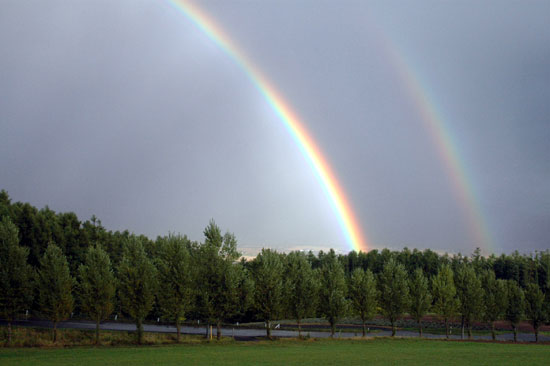 ここに引越して来た理由を コチラで知り合った人に聞かれる事が多い ここに昔から住んでいる人は 神戸みたいに魅力的なところから なんで何にもないようなところに来たのかが 不思議なんやって ここに住んでみて きっと私は 多分 地元の人よりも ここのいい所を見つけるのが上手い・・・と思う 娘の友達のお母さんに 「例えばぁ 虹が端から端まで見えるところとか・・ そんなところが素敵やと思うわっ」 って 話しをしたら 「え!!そんなの当り前よぉ。もしかして他のところは見えないの??」 ってな返事が帰って来た そうよ、虹が端から端までかかってるところなんて 神戸に住んでいた頃は 殆ど見たことなかったもん おまけに こっちの虹は 二重になっていることも 結構多い 今日は二重になっていて 内側の虹は濃いくて 端から端まで まぁ~~るく見えていましたよ!! 雨が降っていても憂鬱にならへんって ええ事やなぁ~ 嬉しくて 友達にもメールしてしまいました♪♪