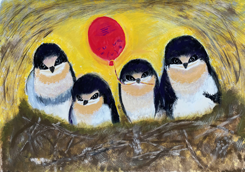 KONさんは動物を描くのが大好きです。特に猫とか犬に関しては上手に短い時間の中でさらりと描くことができます。犬猫の特徴をしっかり捉えている証なのかもしれません。 今回はそういった中で、ツバメの雛が巣の中にいる様子を表現しました。見てわかるように雛が赤い風船をつまんでいるという、こんなことはあり得ない!という姿を表現しています。実際にこういう状態の雛たちを見たらスマホでパチリと撮り、SNSに投稿して、いいね!が何万回も押されてしまうのではないかなと思いました。 私自身もこの作品を見て、思わず笑ってしまい、とても温かい気持ちになりました。 絵画の表現というのは時代を通してその時の私たちの状態を表現することが基本となります。写真がまだ存在しなかったときには、人間社会の様子、風景、人物を丁寧に絵画として残すことを目的として描かれていました。写真が誕生してからの絵画の役目はリアルに外見を写真のように表現するより、人間社会の内面、或いは自然を通して見えてくる社会の内面といった目に見えないモノを表現する傾向が強くなってきました。 そういう意味で現代では人間の持つ感情、喜怒哀楽の表現がとても注目されるようになってきたのです。ところが美術の世界を含めた社会一般では怒・哀の表現がどういうわけかもてはやされました。現代もその傾向は強いと思います。怒・哀の表現は高尚的で喜・楽は少し大衆的と感じられてきたのかもしれません。私は喜・楽にもっと注目して表現されても良いのではと常々思っています。描くことは本来とても楽しい行為で、喜びがあります。その嬉しさとか楽しさをもっともっと前面に押し出した絵画があってもいのではと思います。葛飾北斎も「富嶽三十六景」のような素晴らしく高尚な作品を描いたと思えば人のおかしな行動を漫画的にサラッと描く表現もしています。そして一般の人たちはそれを見て、娯楽として笑い、生活の中に楽しみを見いだしたのかもしれません。そういった笑いを誘うような表現も社会には必要不可欠なのだと思います。時代の要求ということもありますが・・・・ KONさんのこの作品は喜怒哀楽の中でいうと楽の感情が感じられます。笑いを誘う感性が溢れています。今までのKONさんの作品群を見ていると楽に対しての表現を常に思い描いていると感じています。生活の中での小さな1ページにも笑いがあり喜びがあるよ!と優しく呼びかけているように感じます。ツバメの4羽の雛たちの目線が全て方向を変えて描いているのはKONさんの思いと考えが強く感じられます。また風船のうえに描かれた顔、そして糸をつまんでいる雰囲気も雛たちが私たちに何か言ってるように感じがして、思わず「うんうん~」と頷いてしまいました。よくがんばりました、KONさん!