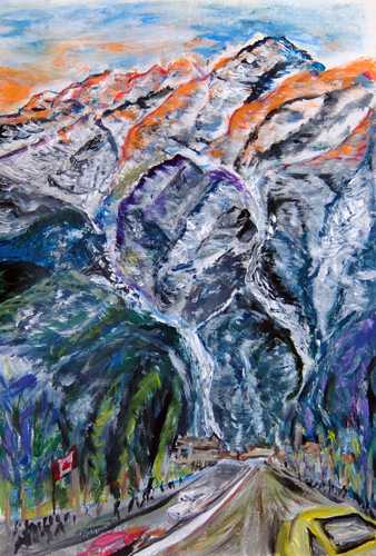 とてもスケールの大きな作品になりました! この作品を描く前に小倉さんはカナダのバンフに旅行に行って日本では見られない壮大なロッキー山脈が目の前に迫ってくる景色に圧倒されたことを話してくれました。その圧倒された情景を絵画として描いてみたいということでした。それがこの作品になりました。 自然の景色が持つ力強さ、荒々しさ、壮大さが溢れていますね。言葉でイメージを表現するより、言葉無しでこの作品を目の前にすると強烈に圧倒されるインパクトを感じられるのではないでしょうか。 小倉さんの描くイメージはとても表現主義的で、心の中で感じ取った思い、イメージが外に向かって弾け飛んでいくような感じです。 小倉さんはカナダの場所で壮大な景色に全身が包み込まれる感覚を受容し、その自分の心に強く残った感覚を今、画用紙の隅々にまでキラキラ輝く星のようにちりばめ、描いていったんだろうなと思いました。 小倉さんの表現は絵画はこうあるべきだとか、こうしなければならないといった制約をそれ程気にしていません。それより小倉さん自身が直感的に感じる色とか筆のタッチをとても大事にしています。絵画では制作者が感じる思いをどうやって表現するかということがまず第一に考えないといけません。そのためには伝統的な技法とか見方を敢えて逸脱して自分自身が納得するイメージを作り上げることも大事になります。 小倉さんの作品を見ているとそういった既成概念にチャレンジすることの大切さがとても強く感じられます。そして小倉さんのアプローチは間違いではなく、正解であるんだということを改めて感じ取りました。 頑張りました、小倉さん。