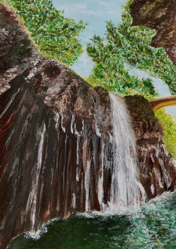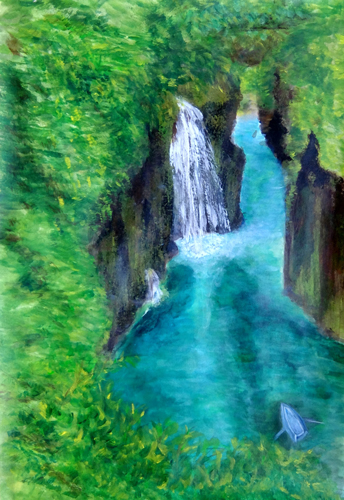 久保さんはこの作品の前に同じ峡谷、宮崎県にある高千穂峡を描いています。その時は高千穂峡を上から眺めた視点で描いています。かなりの時間を費やしてこの高千穂峡の景色を描いたのですが、最終的に満足のいく出来映えにならなかったと悔しがっていました。当然、満足のいくまで筆を走らせ、満足できる域まで諦めずに描き続けることもできたのですが、逆に失敗を繰り返し、何枚も様々な方法、見方を経験しながら、自分の技術、感覚を磨いていく方法もあります。久保さんと私が話し合って後者を選択しました。とりあえず前回の高千穂峡は上手く描けなかった、今回は視点を変えて描いてみようということになりました。そして今回は同じ高千穂峡を下から滝を見上げた視点で描くことにしました。 渓谷に流れる深緑色の透明感のある水、滝の水しぶき、そして艶のある岩肌と自然の醍醐味、そこには様々な自然の美しさが入り交じっています。そして新緑と澄み渡った空の色もこの景色の醍醐味でしょう。それら一つ一つが重なり合い、折り合いながら一つの壮大な自然の景色を作っています。 前回、久保さんは一つ一つの部分としてはまずまず上手く描けたといっていましたが、全体を見ると自然の空気がなぜかバラバラに見えると言ってました。今回、久保さんは色を塗りながらその場の空気感も感じてみようと、制作から感じる空気感に対し、意識を集中しました。写真を基にして描く場合、この空気感を感じながら描くことは非常に難しいことです。実際その場所に行けば、香り、空気、触感など体全体でその場を感じ取ることができますが、写真だけだとその感じ方が視覚のみとなるので、空気を感じ取ることが難しくなります。 でも久保さんは色を何度も塗り直し、描き方を変え、明るさも何度も変化を加えて、できる限りその場所の空気感を表現できるようチャレンジしました。試行錯誤を何度も繰り返すことが、その場の空気感にどんどんと近づける大きなヒントなのかもしれません。そしてできるだけ自分の感覚に正直になれるかということが大事なポイントなのかもしれません。 そして前の高千穂峡とは明らかに違ったその場の空気感を含んだ景色に仕上がりました。 久保さんのこの新作を見ていると、ダイナミックで圧倒されるスケール、そして響きわたる滝の音、ひんやりとした空気、険しい岩肌、そして見上げると鮮やかな空の色といった、全てが一つにまとまった大きな自然の中に自分一人が立っている不思議な空気感を味わえます。 よく頑張りました、久保さん!