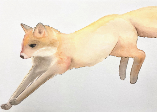 この作品は新作といっても昨年11月に描いたものですから、新作ではないかもしれません。 徳弘さんは最近は水彩色鉛筆を使った水彩画風な表現にチャレンジしています。 水彩画というのはアクリルとか油絵の具と違って光の捉え方が非常に難しいのですが、徳弘さんは少しずつその問題点を理解し、表現の幅を広げていっているように思います。特に色が持つ微妙な変化を表現するために色鉛筆と水を含ませた筆だけで制作する姿勢にはとても大きな進歩を感じさせてくれています。 この作品に見えるような色の繊細さを表現することは直ぐにマスターできるものではなく、何回もの失敗と諦めないチャレンジを繰り返すことによって生まれてくるものです。徳弘さんはそういった繰り返す実験の意味を学んでいるように思います。 そしてとても大事なことですが、ここには表現することの楽しさを作品から感じさせてくれることが強く感じられ、とても嬉しく思いました。良い表現することは作者がまず楽しいという心が根底にないといけません。徳弘さんのこの作品からそのことを強く感じさせてくれます。 この作品の主人公は犬?キツネ?でしょうか。胴体の色の繊細さには驚くばかりです。色鉛筆での色付け、そしてそれを筆で色を溶かしながら微妙な色の変化をつけています。何回も色の変化を加えながら表現していったのでしょう。そして顔のところも微妙な変化を加えています。特に私が唸ったのは鼻から上にいく鼻筋に赤い色が少しはみ出しているところです。全体からいうと徳弘さんにとって、思いもかけずはみ出してしまったと思ったかもしれません。ところがこの薄く見える赤い色が犬?を生き生きとさせる役目を果たしているように感じました。徳弘さんにとっても思いもかけない効果にびっくりしたかもしれません。また下書きで使われた黒のラインが全体ではなく大事な場所だけにラインを見せていることも徳弘さんの表現の進歩を感じました。全体に黒のラインが見えてしまうと堅くなりすぎてしまいます。空間を大きく広く見せるには黒のアウトラインは要所だけで大丈夫ということも徳弘さんは理解してきたように思えます。 よく頑張りました、徳弘さん!