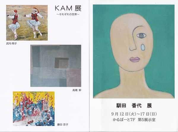 来週、火曜日(9月12日)から日曜日(9月17日)まで、偶然にも私が創作活動に携わっている生徒さん2人の展覧会が同じ建物で開催されます。一人は高橋幹さん 年1回同じ仲間との3人展をずっと続けています。3者3様のとても面白い組み合わせでの展覧会です。高橋さんは抽象画を描いていますが、テーマがかなり絞られてきて、シンプルな表現ですがとても深くて味わいのある表現の追求に真ん中の作品が高橋さんのも尾です。真ん中の作品が高橋さん作です。作品を前でしばらく作品との対話の時間を持つことをおすすめします。シンプルな表現ですが、微妙な変化を作品の中に仕組んでいます。それを少しでも感じられると嬉しいです。馴田香代さん 3年に1度、個展形式で作品を発表しています。具象表現もメインに制作しています。最近は時々抽象的な表現にも意欲を見せています。具象表現と言っても写実的ではありません。それよりも人体、風景、植物などを使って馴田さん自身の個人的な思い、或いは今の社会に対する心象風景を表現していると言っていいでしょう。その心象風景を表現するために人体、風景などをデフォルメします。そのデフォルメが馴田さん自身しかできない独特の味わいを醸し出しています。そこに現代の美術の力を感じます。二人とも長い間制作に関わり、私もその二人に寄り添って励ましてきました。これからもこの関係は続くと思いますが、時間のある方は是非、実際の作品を前にして鑑賞して頂きたいと願っています。そして私たちにとって大事である人間の在り方を感じ取って頂けると嬉しいです。場所 KAM展 高知市文化プラザかるぽーと7階 第4展示室 馴田香代展 かるぽーと7階 第5展示室2023/9/12(火) ~ 9/17(日) 10:00~17:00 (最終日16:00迄)