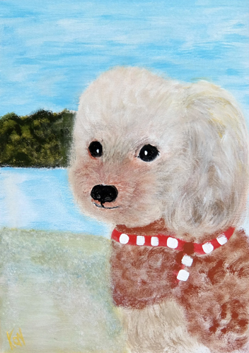 昨日もKONさんの新作をアップしましたが、以前ブログにアップしていた同じ作品を勘違いして再度新しく論評を書いてアップしたのでした。それで今日は皆さんにKONさんのまだ見せていない全く新しい作品の評をアップします。 KONさんは犬、猫を題材とした作品をよく描きます。今回の作品はプードルです。KONさんのお友達の飼っている?プードルを描いたようです。KONさんの描く動物の目はいつもキラキラと輝いています。目の中でキラリと光る箇所が主人公であるプードルに命の輝きをもたらしているようです。目の中に描くほんの僅かの光の場所がとても絶妙で、プードルに生命と愛情のある姿を生んでいるような気がします。KONさんの他の作品に描いた犬とか猫にも同様の目の輝きがあり、これはKONさんが動物たちに授ける愛情表現なのかもしれません。 最近のKONさんの描く動物たちは更に毛並みがとても繊細で、微妙な色の違いと柔らかさを感じます。KONさんは以前、絵の具を使って描く時、色と筆の使い方が学校で教わった方法が基本で、その枠内で描いていました。ところが絵の具にも様々な種類があり、描き方にも一辺倒ではなく幅広い捉え方、方法があることを学びました。また筆も使い方によって様々な違った表現ができることにも気がつきました。こんな感じに見せるには筆をどうやって使えば良いのか?どうやって絵の具を使えば良いのか、そういったことが徐々にわかってきました。これは台所で料理をする道具と食材をどう組み合わせるかということと、とても似通った感覚かもしれません。この作品で見られるプードルの毛並み、柔らかさ、美しさの表現はKONさんのこういった研究と学びの賜物かもしれません。。 またこの作品において、KONさんは画面中央に主人公であるプードルを描くのではなく、画面右側に寄せて描いています。そうすることによって背景にある島?そして砂浜、海、空も画面の中でプードルと一体感を生む雰囲気を創っています。KONさんの考えた小さいけれどとても効果的なアイデアですね。そしてプードルの優しい表情が何か私たちをこの景色に誘っているような表現になっています。 よく頑張りました、KONさん!