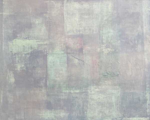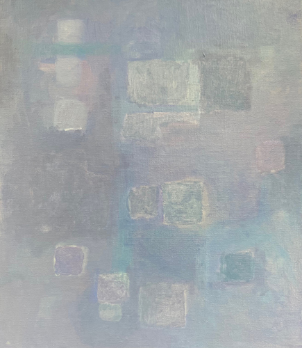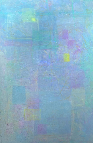 高橋さんは以前から一貫して四角という形と線を使いながら抽象イメージを追求しています。 作品の中で、色彩を強く見せず、どちらかというと中間色的な灰色に集約していこうという意図があるようです。 今回の作品もぼんやりとした曖昧な色を使いながら、その中に四角という形が微かに浮かび上がってくるような趣を創り上げています。色彩がぼんやりとしているため、作品から発する視覚言語を読み解いていくためには少し多めの時間を必要とするかもしれません。 現代、特に21世紀に入って美術自体もわかりやすく短い鑑賞時間で理解できる、明瞭であるといった単純明快に鑑賞できる作品が多く好まれてきています。これは時代の流れでもあり、感覚的に時間の流れが速くなってきている現代に求められている芸術の方向性なのかもしれません。 逆に言うと一つのモノに長い時間をかけて理解する、深く読み解くという行動は避ける時代なのかもしれません。 それに対して、高橋さんの作品を鑑賞する場合、しっかりと作品を読むという少し長い時間が必要で、ぼんやりとしたイメージの中に隠された視覚言語を読み解く時間も必要で、今の時代に求められる単純明快とか分かりやすいという観点からは逆の方向性にあるかもしれません。 ただ単にこの作品がわかった、わからない、綺麗、美しいといった単発で時間をかけない判断は高橋さんの作品には当てはまらないような気がします。 高橋さんの作品を鑑賞するためには、1冊の本をじっくりと味わいながら読むといった感覚が求められるでしょう。 この作品は画面の空間にたくさんの四角が浮遊しているように描かれています。1カ所にしっかりと根を生やして留まっているのではなく、ふわふわと浮遊している四角を感じます。その浮遊感は僅かの動きを感じさせているのですが、ここに高橋さんの新しい試みをしてるように感じます。その動きは左右ではなく、画面の前後に動いているようです。画面の空間奥から微かに前に動いている、或いは前から奥に微かに動いているように感じます。 こういった動きを感じさせる作品は、あまり他では見られません。20世紀前半では未来派というイタリアの1派が時間の流れを見せる作品を公開しました。現代ではアメリカのスーザン・ローゼンバーグという女流画家がダンサーの動きを見せる作品を1時期創っていました。高橋さんの新作ではそれらの動きを見せる作品とは少し違いますが、空間の中で感じられる微かな動きという面では似ているかもしれません。 いずれにしても高橋さんの作品を見る場合、しっかりと時間を使って作品と対話してほしいと思います。そしてそこから、鑑賞者は人間にとって大事な何かを感じるような気がします。 よく頑張りました、高橋さん!