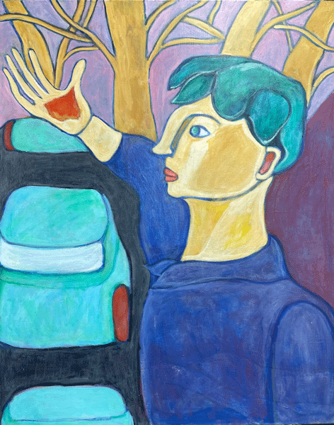 馴田さんは長い間、人物を主体に描いています。人物を主体といってもリアリズム的な視点というよりも人間の姿をつかって馴田さん自身の感じていること(社会、世界、人間の在り方)を表現しています。ですから人間の骨格に対して間違いでは?という見方ではなく、画面全体の中で人物はどのような立ち位置を見せようとしているか、或いはどのように感じることができるかという視点を持って馴田さんの作品を鑑賞する必要があります。そういった視点を軸にして馴田さんの作品を見ていくと、至って自然で、馴田さん自身の感じている思いと触れ合える作品ではないかと思っています。この絵画は若い青年が描かれています。右手を挙げてますが手のひらには赤い布か紙が置かれています。とても大事そうな感じがしますが、私にはそれがなにか分かりませんが、とても大事なものではという感じがします。そして青年は左の数台の車の方向を見ています。車というのは現代文明では欠くことのできない利器でしょう。その逆に青年の右方向は全く何もない少し暗くて空虚な感じのする空間を描いています。この左右の対比はこの絵にはとても大事なキーなのかもしれません。画面奥には木が描かれていますが、緑の葉っぱは一つも描かれていません。青年の左側に見える世界と,右に見える世界の違い、そして奥に見える自然の様子をみると、この青年の置かれている立場というのは今の世界における若者たちの置かれている立場を表現しているのかなと感じました。でも馴田さんはそのことに対して答えは出していませんが、本当にこれでいいのだろうか?という疑問を馴田さんは私たちに投げかけているように感じます。絵画というのは多種多様な表現が可能です。その絵画を感じ、読み取っていくことは制作者の思いに近づき、鑑賞することの最も大切なことで、それは大きな醍醐味であると感じました。