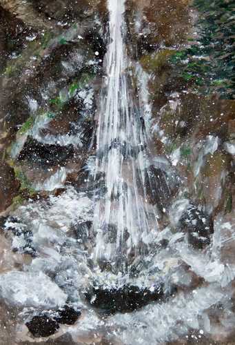 久保さんの作品は1枚1枚描くごとにどんどん進化しています。 数ヶ月前の最初の頃の制作はおそりおそる、描けるかな?大丈夫だろうかという不安な気持ちをベースにした作品でした。面白いもので不安な気持ちがあると、どれだけ丁寧に上手く描けていても、その不安感を投影した作品になります。私自身はそういった不安感を感じさせる作品も人の微妙な心のあやを感じて好きなんですが、久保さんのこの新作はそういった不安感を感じさせてくれるというより、久保さん自身の心の内にある強い意志というモノを感じさせて圧倒される作品になったなと感じています。 これは高知県の山の中?にある小さな滝を描いたものです。滝の名前はあると思いますが、私には分かりません。久保さん自身は知っていると思いますが・・・。久保さんが描く前にこの滝の写真を見せてくれました。その時はこの作品のように激しさはあまり感じませんでした。激しさというより冬場の寒さとか津々とした流れが感じられる写真でした。それが制作を続けている内に、滝の勢いと激しさが画面に溢れんばかりの強烈なイメージに変化してきました。 絵画というのは平面で静止した状況の表現です。ある意味全てが静止して動かない状態の表現です。ところが作品の裏側から音が聞こえてきたり、動きを感じたり、香りまでも感じることがあります。じっと作品を見つめていると作品が動き始めるように感じることもあります。久保さんのこの作品からは音、香り、動きを正に感じさせてくれる絵画になったと思いました。そこには久保さんの制作する上での大きな成長があるのでしょう。自分自身の心と正直に向き合って描いた証なのかもしれません。 現代は映画、テレビ、アニメと画面がどんどん変化してストーリーを追いかける表現がメインです。私たちはそれが当たり前と感じていますが、逆に静止した表現の奥深さと面白さをもっと感じても良いかなと思いました。 久保さん、頑張りました!