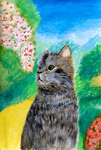 KONさんは猫とか犬を描くのが大好きです。描けば描くほど描く技術が上達するということがKONさんの作品を見て感じます。 この猫ちゃんはまるで生きていて今にも動き出しそうな感じです。それ程、猫をリアルに描くことができはじめたということでしょうか。 リアルに見えてくる猫の表現にKONさんは2点、とても気をつけて描いたことがわかります。 1点は目の表現です。特に目の中に見える光です。制作者が実物の目の色を表現しても、そこに光を感じなかったら何も感じないでしょう。そこに光を感じ、特にハイライト(光の反射)の表現に気をつけて描くと動物、自然、或いは人間の表現にしてもそこに命という大事な鼓動が生まれてきます。 この場合猫の目に見えるほんの僅かの白い点が光の反射になります。僅かのタッチですが絵の表現の中ではとても大きなパワーを生み出しました。お見事です。 もう1点は、猫の毛並みでしょう。とてもリアルな毛並みを感じさせてくれます。ではこの毛並みをどうやって表現したのかという疑問がわいてきます。猫の毛を1本1本丁寧に描いたのか?と思わせますが、KONさんはそういった時間のかかる緻密な作業はしていません。筆の使い方、絵の具の塗り方(ここではウエット オン ウエット)という技術を使っています。乾いていない下地の色と新しい色を画用紙の上で塗り重ねながら表現する方法です。パレットの中で色を完全に作ってから表現するということではありません。この方法は印象派、表現主義といった絵画にもよく使われ、また抽象絵画の表現にも応用できる方法です。 この猫の毛並みと目の光がこの作品を生き生きと輝かせた大きな要因だと思います。 猫と背景とのコントラストも良い感じになりました。猫のリアルさと背景との雰囲気の違いがより一層、猫を引きだたせているのかもしれません。近くにいる猫はディテールがはっきり見える感じ、背景はぼんやりと遠くに見える感じの違いがうまく画面を作っているのかもしれません。 ここで注意しなければならないのが、画面の統一感です。描く対象物と背景が分離してしまうと画面の統一感が失われてきます。KONさんは画面の統一感を作るために猫と背景の流れを一体化させることを試みたようですね。背景から猫に流れる、猫から背景に流れる構図を作って画面の一体感を生み出そうとしたのでしょう。 KONさんは大好きな猫を描きながら、どうすればもっと良い表現になるか、様々な新しいことにチャレンジしてることが見て取れます。 よく頑張りました、KONさん!