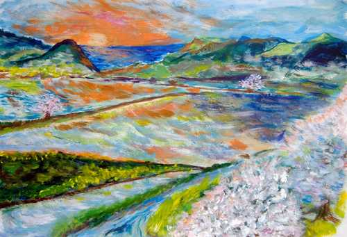 小倉さんの新作は水を張った田んぼの情景を基本にした風景です。遠くには日没時?(もしかして朝時かもしれません)の太陽、海、山々、そして近くには桜の花が描かれています。都会ではなかなか見られない田んぼの風景を捉えています。特に田植え前の水を張っただけの田んぼは田舎に住んでいる人たちにとっては春先の当たり前の景色ですが、都会に住む人たちにはなかなかお目にかかれない風景かもしれません。 小倉さんは水を張っただけの田んぼに美しさを見ました。色合いから言うと、水を張っていても泥水の状態ですから土色です。決して透き通った綺麗な田んぼの水ではありません。逆に濁りのある泥水といった方が良いかもしれません。その水面に小倉さんは美しさを感じ、絵にしてみようと思ったのでしょうか。 小倉さんは田んぼの水面のみを見て美しさを感じたのでしょうか? 私は水を張った田んぼの周りに見える山々、遠くに見える海、太陽の光、近くに咲く桜の花など小倉さんを囲む全ての景色から「綺麗だ、美しい」と感じたのではないかと思っています。そこには風のそよぎ、花と言わず自然の香りなども大きく影響したのではないでしょうか。そしてその中心に水を張った田んぼの存在があったのではないかと思います。そしてその存在感が小倉さんの心を圧倒したのでしょう。 美しさを感じるというのは私たちの感性に触れ、同じような波長を感じた時に生まれます。理論的にこの形が素晴らしくて美しいと言っても、私たちの感じている波長と合わない、感性とかけ離れていると美しいと感じる響きは生まれません。身近にある何でもない風景、或いはモノにしても美しさを感じることがあります。壮大な景色を見て美しさを感じるのもありますが、何でもない小さなところに美しさを感じることもあります。 小倉さんは日常の当たり前にある風景の中にある様々な断片から心に響く美しさを感じ取ったのでしょう。 19世紀のイギリスの画家でターナーという方がいました。彼の絵は自然の風景とか歴史的な出来事を表現していましたが、大気、或いは空気感に対してとても繊細な表現力を持っていました。小倉さんの作品を見ていると何故だかターナーとか印象派の作品を思い浮かべてしまいます。これは小倉さんの作品には彼らが見ようとしていた空気感が同じように感じられるからかもしれません。 よく頑張りました、小倉さん!