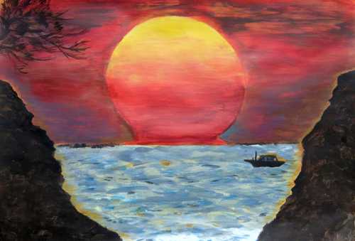 高知では冬の季節にとても有名な「だるま夕日」という夕焼けが見られます。特に高知県の西端にある宿毛市で見られる「だるま夕日」は有名です。安芸という東にある場所でも見られますから、宿毛市だけで見られる夕焼けではないのでしょう。海に沈んでいく夕日と水平線が交わるところに少し幅が広がっているように見えるわずかの時間があります。そのわずかの時間がまるでだるまのように見えるところから「だるま夕日」と言われるようになったらしいです。 久保さんはその「だるま夕日」を表現したいということで、チャレンジしました。久保さんはスマホの中に入れてあった「だるま夕日」の写真を元に表現したのですが、色のグラデーションにとても苦心しました。写真で見られるようなグラデーションはなかなか難しく、色のばらつきが現れてしまいます。 私とすれば、絵画と写真は違いますから、写真のようなグラデーションをあえて求めなくても良いかなと感じてます。絵画には絵画独特の良さがあります。それは描くという手作業に制作者の強い意志が感じられ、その中に鑑賞者に直接響いてくる面白味があることと思っています。写真であれば、視覚的美しさが全面に表れ、制作者の時間をかけて試行錯誤している移ろいは省かれてしまいがちです。 この作品では久保さんはグラデーションの表現に苦労しました。でもその苦労した表現が、逆に久保さんの制作中に感じた思いというものが大きく表現されていると思います。「だるま夕日」も少し歪になっていますが、それも絵画では逆に良いことだと思います。完全な形ではない人の手作業としての不確かさが、逆に作品の中に制作者自身(久保さん)の暖かい心を感じさせてくれます。 海の右側に浮かぶ船、そして画面左上には逆光で黒く見える木(松でしょうか?)が画面のバランスを作り上げています。そして船、木、岩場のシルエットはただ単に暗く描くだけでなく、オレンジ色のアウトラインを入れて夕日の光を感じるように描いているのはとても考えられていますね。 絵画というのはただ写実するということではありません。あくまでも制作者の心のフィルターを通してどのように感じているか、どのように思っているかという制作者の素直な心の表現だと思います。この作品から久保さん自身の心が素直に表現でき始めていると感じました。 久保さん、頑張りました。