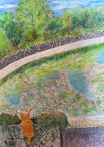 KONさんの微笑ましいストーリーを感じる新作です。この絵の中にいる主人公は左手前に見える猫ちゃんでしょう。塀によじ登って景色を見ている姿には思わず笑ってしまいます。どんな顔をしているのか、なんだか目の奥に浮かんでくるようです。そしてこの猫は子猫ですね。必死で塀によじ登って池の水面に浮かんで見える林の景色に驚いているのか、はたまた池に映る空の色に驚いているのか、私たち鑑賞者の想像力に刺激を与えてくれるイメージがこの作品にはあります。KONさんの作品は童話のような柔らかい物語を感じるイメージが溢れているようです。今回の新作は、そういった物語を感じさせるイメージに加えて、絵画として色に対する味、そして画面を作る構成力にも一段と大きな進歩が見えてきました。色は単純な選択から生じる色合いではなく、どうすれば深みを感じることのできる色合いを見せられるか、かなり試行錯誤されたように見えます。制作途中で行ったり来たりと右往左往する迷いの時間を感じます。でもこの迷いの時間があり、そこからやっと選択できた色というのはどういうわけか、色そのものに尊さを感じます。KONさんの今回の絵からそういった色に対しての尊さを強く感じます。また画面構成にしても主人公である子猫をあえて画面の下隅に配置しました。そうすることによって大きな広い空間を感じさせる構図になったと思います。そのこともKONさんの絵画に対する大きなステップになったように感じます。私は童話のような優しい思わず微笑んでしまう様な作品を制作するKONさんに大きな拍手を送りたいと思います!!!