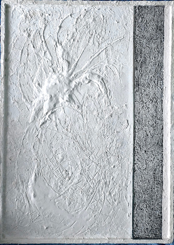角田さんの新作は高知市展に出品した作品です。 角田さん得意の白黒で表現した平面作品ですが、大きな特徴は画面から感じられる立体的な造形でしょう。半立体、リリーフ作品と言っていいかもしれません。 角田さんがこの作品で使用した材料は漆喰という家屋の壁(外壁、内壁)に使用される日本の伝統的な建材です。西洋美術でよく使われる石膏と似通った材料と言っても良いかもしれません。 角田さんはこの漆喰を平面の上に厚く塗り、その厚みを上手くコントロールしながら平面の中に凹凸感を見せようとしているのがわかります。その凹凸を機械的に見せるのではなく、逆に角田さん自身の感情が全面にほとばしるような感性が表現できるような使い方をしています。 角田さんはそれだけでなく、漆喰をナイフのような金属製のモノで画面切り裂き、亀裂を作ろうとしているのも見て取れます。 そこから感じられるのは角田さん自身の心の内側、或いは心の中の葛藤といった揺れが伝わってきます。とても繊細で揺れ動く心を感じます。 美術作品では「不安定の中の安定」というとても大事な言葉があります。多くの人は安定を望みます。安定の中の安定というとほとんど動きがなく面白みがありません。ところが、どこか不安定そうで何か気になる、でも全体的に見ると安定した表現になっている美術作品は人々の目を強く引きつけます。角田さんの作品にはそういった不安定さも感じられます。 全ての人は、普段は外からは見えないけれども、とても大事な心を保持しています。人間が人間であるために、どうしても忘れてはいけない、大切にしなければいけない「心」です。角田さんはその心の揺れというモノを何とか視覚化させようとしてるように感じます。そして表現としてその思いが鑑賞者に上手く伝わる作品になっているのではないでしょうか。 私はこの作品の中で作品右側にある濃い灰色の部分(鉛筆による線が描かれています)にとても興味を持ちました。作品として角田さんはどうしてもこの部分が必要と感じたのでしょう。漆喰の荒々しい表現と比べると、この部分はとても静かで穏やかな印象を受けます。この部分も角田さんの心の一部なんでしょう。荒々しい漆喰の部分と穏やかな部分、それが共存している表現です。この二つの対比を角田さんがどうやって上手く融合させるのか、次のステップが見えてきたように感じます。よく頑張りました、角田さん!