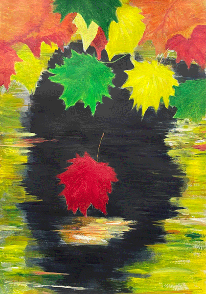 秋の季節によく見られるイメージなのでしょうか~。紅葉の葉がひらひらと落ちている様子のようですね。 画面を見ると具体的にはっきりとわかるイメージは紅葉しかありません。他のものはとても抽象的にイメージをぼかして表現しています。ところが紅葉の葉はとても強烈な色を使い、まるで画面から飛び出してきそうな感じもします。背景は抽象的に描かれていますが、久保さんは横の流れを意識して描いているようです。 紅葉した葉っぱが上から下にゆるりと落ちていく雰囲気の中に背景は横に流れる雰囲気を作り、画面の中に縦に流れる、横に流れる雰囲気を組み合わせているのでしょう。そうすることによって、とてもゆっくりとした動きを画面に作り出しているのだと思います。描く対象物、背景も同じ方向に流れていくと、画面全体はとても速く動くような感じになります。それを上下左右の動きを相反させ、視覚的に感じる動きをゆっくりさせたのでしょう。 また、最初にも言ったように具体的なイメージと抽象的なイメージを一つの画面に組み合わせることも久保さんにとって初めてのことであり、とても大きなチャレンジになったと思いました。 紅葉の葉っぱは赤、黄色、緑の3色で描かれていますが、その3色も葉によって少しずつ明るさを変えて変化をつけています。そうすることによって画面の中にリズムが生まれてきてます。 絵画の制作に対して、少しずつ思索しながら、そして試行錯誤しながら、絵画の深みを理解しようとしていることが久保さんのこの絵から感じられとても嬉しく思いました。どんどんと成長していますね!