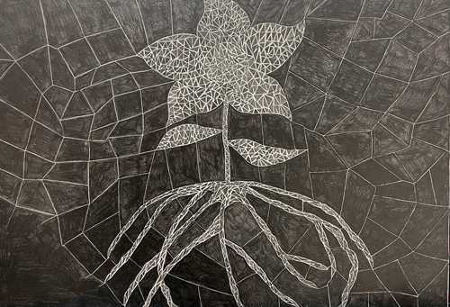 徳弘さんはこの作品を鉛筆1本で仕上げました。前回、濵田くるりさんの鉛筆での作品をデッサンとして講評しましたが、徳弘さんの作品はデッサンではありません。絵の具ではなく鉛筆という媒体での絵画表現です。 1本の花と思いますが、そのイメージを白黒で表現しています。かなり細かい作業を諦めることなく最後まで集中して仕上げています。鉛筆の黒の色を画用紙に刻みながら一つ一つの線を根気よく画面いっぱいに広げていきまひた。 この作品で注意深く観察してほしいのは花の植物に見える幾何学形態(三角形)と背景に見える幾何学形態(四角形)を最後まで繰り返し繋げながら表現しているところです。 現代美術の中でとても重要な概念として繰り返し(リピート)の構造というのがあります。画面構成する上で同じ形態を繰り返すことで一つの単体としてのイメージをできる限り排除し、逆に全体で単体とは違ったイメージを感じさせる捉え方があります。そのことがよく分かるのはアンディ・ウオーのコカ・コーラの作品があります。コカ・コーラ1本のイメージだとコカ・コーラだとすぐに把握できますが、それが100本並ぶ(繰り返し)と、鑑賞者はコカ・コーラとすぐには把握できなくなります。単体での特徴が消えてしまうのです。 徳弘さんの作品にはそれと同じような概念が感じられます。花のところでは三角形、背景は四角形がびっしりと敷き詰められていますが、三角形、四角形とすぐに把握できたでしょうか?鑑賞者は一種の模様ととして全体を認識したのではないでしょうか。 徳弘さんは本格的に絵画を描き始めてまだそれ程長くはありません。でも今回仕上げた作品を見てると、表現するって面白いなあと彼女自身が強く感じたように思います。この作品にはたくさんの新しい情報あるいは宝石の原石のような宝物が含有されています。これから徳弘さんはそれらの情報を整理しながら、そして更に新しくてキラキラ輝く面白い情報を加えながら作品を作っていくのでしょう。頑張りました、徳弘さん!