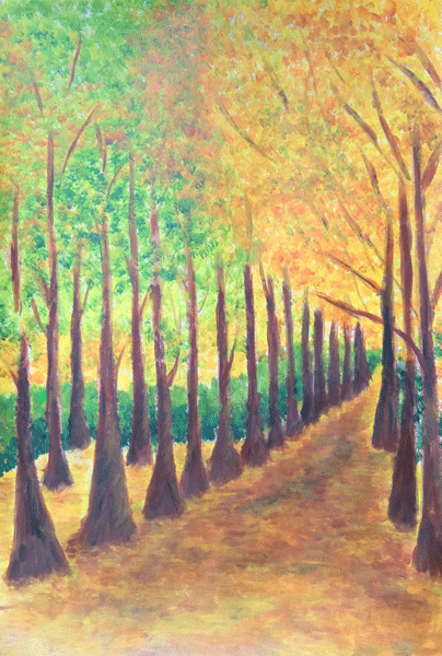 紅葉の季節の風景です。 木立から見せる遠近感が見事に感じられる視点ですね。 絵画というのは平面に形と色を見せる芸術です。その色と形から鑑賞者の感性に響くイメージを提供するわけですが、久保さんのこの作品からは何故かとても心地良い空気を感じます。それは私たちが経験として心の中に宿してる空気感を感じるからかもしれません。 昔こういったところを歩いたとか、散歩した場所だったり、そういった場所の空気を私たちは今もなお心の中に持っているような気がします。日本にいる私たちだけでなく、世界中の人たちが共通して持っているイメージなのかもしれません。紅葉のない国、地域の人々にとっても心に響く風景かもしれません。 また久保さんの作品には微妙な配色に大きな進歩が見られます。それは中間色(混色)をどうやって表現するかというアプローチです。今までだと絵の具のチューブから出した色をメインに使っていましたが、今回はチューブから出した色を混ぜ合わせて、中間的な色を主体に画面構成しています。そのせいもあって、画面全体が柔らかくて落ち着きのある風情になりました。原色が画面の中で多くなると、イメージが強くなります。中間色が主体になるとイメージが柔らかくなります。久保さんは制作を通して色の持ち味を少しずつ理解してきたのでしょう。 画面に見える木々、そして紅葉、緑葉を見てみると、久保さんはそれぞれのディテールにはそれ程こだわっていません。それより、その場の空気、雰囲気にこだわりを持って表現していることが分かります。具象、抽象絵画共々、画面から感じる雰囲気というのはとても大事で、画面全体を把握するための大きな鍵となります。 久保さんはそのことに対しても少しずつ理解してきていると感じました。よく頑張りました!