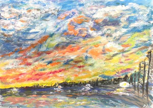 小倉さんの作品から受ける印象は強烈な色彩からほとばしる小倉さんの心の声が聞こえてくる感じがします。この作品からは自然の風景(川なのか海辺なのか分かりませんが)とその中に見える町並みがとても上手く絡み合い、色鮮やかな夕焼けと共に壮大なスケール感を感じさせ手くれます。 筆のタッチは荒々しさを感じ、鑑賞する人の心に打ち付けてくる感じがします。作品から強烈な個性を感じ、作者である小倉さんも激しい人物なのかと思いますが、実際はとても穏やかな人であるということにも驚きを感じます。有名な作家にしても作品はとても激しく感じても実際の作者は穏やかであると言うことが多々あります。また作品は穏やかで優しさを感じても作家自身はとても激しい人であると言うこともあるわけです。ですから作品だけ見て作家自身の性格まで分かったつもりになるのではなく、実際の作者と言葉を交わし、その上で作者の気持ち、性格を感じるのが大切かなというのが個人的な意見です。 では作品をどのように見ていけば良いのかということになりますが、絵画作品というのは平面のうえに色と形を組み合わせていく表現です。それは具象でも抽象でも全く同じ作業です。作者はその色と形をどのように組み合わせるか、作者は思考を繰り返し、感性と理性を働かして作品を作り上げていきます。どちらか一方が欠けても良い作品にはなりません。作品を前にして鑑賞者は作者の感性と理性を読み解いていく読解力が必要になります。ただこの作品が好きだとか嫌いだという先の読み解いていく作業が必要になります。 小倉さんの作品を読む時、強烈な色使いとタッチが目に飛び込み、激しさを感じるでしょう。そのあとに色の配色、画面の構成、形をどのように作っていってるか読み解こうとすると、小倉さんの知的な作業が見え始め、激しさだけでない柔らかい心を見ることができるかもしれません。 20世紀初頭に、ヨーロッパでは表現主義とかフォービズム(野獣派)といった流れがありました。小倉さんの作品にも共通するような作品が多数見られます。その中でも表現主義のエミール・ノルデ、ボナール、ヤウレンスキーなどの作品に共通点があるかもしれません。もし興味があれば彼らの作品を検索してみてください。 小倉さんのこの作品から受ける印象は,強く脳裏に焼き付き,イメージが残り続けるような感じがしますね。 よく頑張りました!
