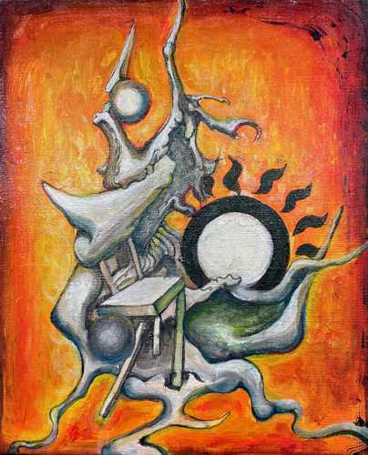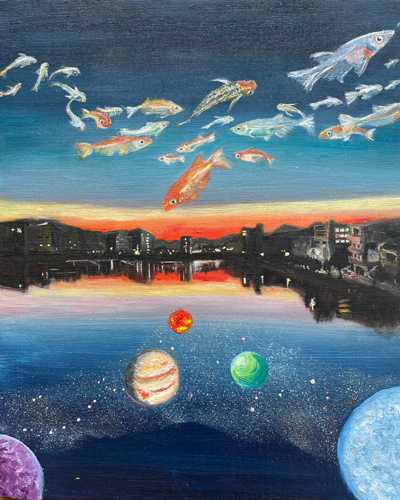 田中さんの前作は恐竜を題材にしたイメージを表現しました。今回はメダカと惑星を組み合わせた、とてもシュールなイメージを作り上げました。田中さんは現実ではあり得ない、絵画でしか表現できそうもない夢の世界を視覚的に表現しようとしています。専門的な言葉で言いますと、シュールレアリズムの絵画と言って良いかもしれません。シュールレアリズムというのは20世紀前半にヨーロッパで起こった芸術運動で、夢の世界のような意識下で起こる行動とか現象もれっきとした人間の一部ととらえ、それを文学とか美術とかに応用した運動です。有名なところではサルバトール・ダリがシュールレアリズムの画家といわれています。芸術だけでなく、精神医学の世界でも夢を研究したフロイトがシュールレアリズムに多大の影響を与えました。さて田中さんの新作は夕暮れ時の空、町並みと川が描かれています。その中で暗闇の迫った空にはめだか(金魚?)がまるで雲のように泳いでいます。その逆に川には魚ではなく星空(天の川?)が流れていて、そして惑星?がちりばめられています。空には魚、川には星という現実ではあり得ない逆転の発想を田中さんはこの絵画で見せようとしています。現実ではありえないイメージを見せられた時、私たちはそのイメージを何とか理解しようと努力します。作者の思いはいったいどこにあるのか、さらにこのイメージをどうやって理解すれば良いか自分の心との対話を始めます。シュールレアリズムの絵画は驚きの表現が強いですが、そこからわからないといった目を背ける行為ではなく、何故!どうして!これはいったい何!といった自問自答する時間をしっかり持つことがシュールレアリズムの絵画を理解する上ではとても大事になってきます。田中さんのこの作品はとても面白い対比(星と魚、空と川)を作ることによって画面全体のイメージに迫力と調和を作り上げました。そしてこのイメージには田中さんの優しさと包容力を感じさせるゆったりとした時間を感じさせてくれます。