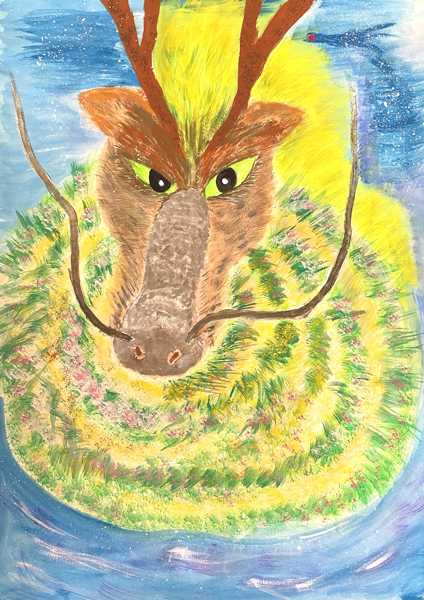 今回のKONさんの作品は今年の干支、龍を基にして作品を描いています。 KONさんが作り出すイメージはどこかほのぼのさせるメルヘンとか童話、絵本の中に出てくるような優しさがあります。 今回KONさんが作品として選んだ対象物は龍で干支の中で唯一想像の世界にある生き物です。何か実際の動物、生き物を基にして作り上げられたモノだとは思いますが、今では空を飛ぶとか、火を噴くとか、翼があるとか、長い胴体を持っているとかといった様々なイメージで表現されています。もしかすると龍は他の干支と比べると多種多様な表現ができるどんどんと変化し続ける生き物なのかもしれません。 そういったなかでKONさんは龍の顔を基本にして、長い胴体をぐるぐるととぐろを巻いた表現にしています。翼を広げて優雅に空を飛んだり、炎をはいて強く見せているようではありません。ちょっと疲れたからこのへんで休憩しようといった、休みの状態に入った龍のように感じます。どこか強そうな感じもありますが、息づかいを整えようとしている面白さを感じてしまいます。 龍のたてがみは黄金のようで気品を感じます。左右に延びるひげは左右対称にはせず変化をつけているのは絶妙の味を感じさせています。制作の途中でひげは白色で塗っていましたが、それを薄い茶系に変えたのはとても良かったと思います。絵画の色で白と黒は「色では無い色」というふうに解釈されています。基本的に白と黒は他の色と混ぜて、色を明るくしたり、逆に暗くするための色と解釈して良いかもしれません。画面の一部を白のみ、黒のみで表現すると、その部分だけ突出した感じになってしまいます。画面の統一感を崩してしまう可能性があります。ですから白だけ、黒だけを使いたいと思ったときはかなり気をつけて使わないといけません。 KONさんはこの場合、とても良い判断をしたと感じました。 KONさんは背景に海でしょうか、川でしょうか、水の雰囲気を想定して描いています。画面上部の背景は横に流れる感じ、そして画面下部は円を描く流れを作っています。この違った流れを表現したのは、簡単そうですが、とても難しい選択だったと思います。全て円形の流れにするとか、全て横の流れにするとかにすると、全体の雰囲気もガラッと変わってしまいます。私個人的にはKONさんの違った流れを作る選択は素晴らしかったと思いました。そしてその流れの中に暖色系の紫を混ぜ、龍の胴体にあるピンク系の色に合わせて描いたことも妙技でした。 KONさん、頑張りました!