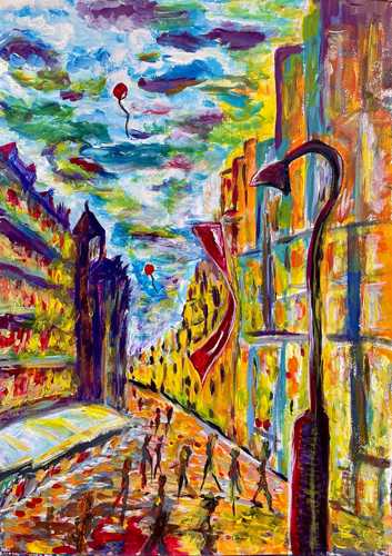 小倉さんがオーストリアに旅したときに感じた夕暮れ時の町並みを表現した1枚の絵です。ヨーロッパの町並みには日本にはない深い文化を感じると小倉さんは言ってました。そしてそこにある空気、香り、光を表現できれば良いなとつぶやいていました。小倉さんは決して町並みの風景を写実的に正確に表現しようとしていません。というより、この場所で感じた空気感、光明感に対する印象の正確さを求めているように感じます。20世紀初頭にヨーロッパで生まれた印象派、そして野獣派(フォービズム)、或いは表現主義の絵画と似通った要素がこの絵から感じられます。それらの流れには写実と言っても全て作者自身の心のフィルターを通した表現がメインの柱として存在します。ゴッホ、モネ、マティスなどの絵画には自然に対して作者の感じた印象が光り、空気などを媒体として表現されています。小倉さんの絵画にはオーストリアの町並みを表現していますが、そこには小倉さん自身がこの風景から感じ取った印象を、また小倉さんの心を全面的に表現したのだと感じます。私はこの絵画を見て、風景の写実と言うより小倉さんの熱い思い、圧倒される空気そのものを全面から感じさせられます。夕暮れ時だと思いますが、建物の中から放たれる光、そして旗の揺らめき、風船からはこの場所に存在する空気、風、道の石畳からは人々のざわめき、香りなどを感じさせてくれます。それらは全て小倉さん自身がこの場所から受けた印象なのでしょう。作者が感動した印象を鑑賞者も同じように絵画を通して感動できることは素晴らしいなと思います。絵画の面白いところはこういった作者の受けた思いを絵画という媒体を通して、同じように感じられる楽しみがあるということなのかもしれません。この絵画では小倉さんは様々な原色系統の色を使い、色彩が画面から溢れんばかりに表現しています。色に圧倒される感じですね。こういった色彩もこの絵画の魅力の一つかもしれません。自然の色を無視してるわけではなく、もっと幅広く自然の持つ色彩を捉えようという意識なのでしょうか。これから小倉さんがどんな表現をするのか、とても楽しみです。