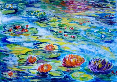 小倉さんは池に浮かぶ睡蓮の花を描いています。睡蓮の花を描いた作品で有名なのはモネの睡蓮がすぐに頭に浮かぶのではないでしょうか。小倉さんの描いた睡蓮を見ると、どこかモネの描いた睡蓮にも似通ったところもありますが、小倉さんの作品にはモネとは違う独特の味わいを感じます。 小倉さんは睡蓮の花を観察するために高知の「モネの庭」という庭園に何度を足を運んだそうです。たくさん写真も撮り、睡蓮の花の形とか池の雰囲気を観察したようです。当然、モネの睡蓮を意識して自分の作品を描こうと思ったのでしょう。 モネは20世紀初頭に始まった美術の流れである印象派の作家です。印象派は画家たちがアトリエで描くことから外に飛び出し、外の光、太陽の光、或いは自然の光を作品に取り込もうとした流れです。その光を表現するために、写実的な表現形態を崩していくことも試みました。印象派の絵画はあくまでも光という存在を主軸においたのです。モネも例外ではなく外に自然の光を巧みに表現しました。そして光に含まれる空気、雰囲気を絵画に取り入れていきました。 小倉さんの作品を見ていると、そういった印象派的な自然の光も強く感じます。でもそういった光を感じる雰囲気の中で睡蓮の浮かぶ池の中に漂う水という存在を主軸にして画面全体に表現しようとしているように感じました。 作品は睡蓮の花を描いています。そして睡蓮の花は当然、作品の中で主張しています。しかし池の水が緩やかな流れを作り、その水が織りなすせせらぎが微かに聞こえてくるような表現になっていると感じました。 作品を詳しく見てると水の色を現す青色と光の色を現す黄色が画面上で柔らかく十字状に交差させているのが判ります。小倉さん独特の表現方法ですね。 よく頑張りました、小倉さん!