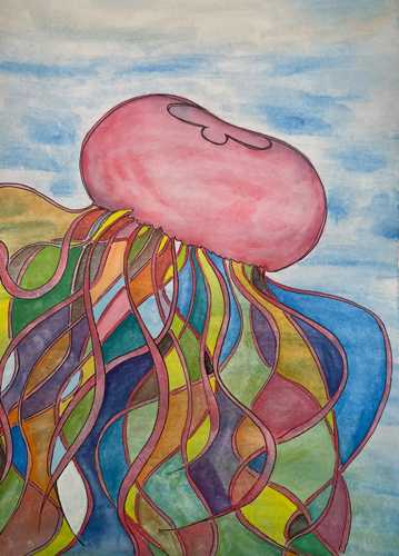 徳弘さんはイラストとかグラフィックデザイン系の視覚表現に興味を持っています。 デザインは鑑賞者が表現に対して如何にそのイメージを短い時間の中で理解し、視覚として共鳴できる作品にすることが大きな目標となります。ですからデザインを発注するクライアントのことをしっかりと理解し、イメージのコンセプトを作り上げることが重要になってきます。 教室の中では発注者であるクライアントはいませんから、徳弘さんが自分自身でどういった視覚イメージにするか決めないといけません。この中で徳弘さんが特に注意したことはどんな題材を使うか、そしてその題材をどういう風にアレンジできるかということでしょう。 そしてこの作品から視覚的に理解できるのはクラゲをモチーフにしたのかな?というイメージの題材ですね。そして曲線の流れの中に見える様々な色の組み合わせはまるでステンドグラスのようにアレンジしたのでは?ということでしょう。 この表現は徳弘さんがとても明確に組み立てたイラストのように感じました。軟らかい視覚表現を感じるデザインで、もしもクライアントがいれば、何かに使ってみたいと感じる作品です。そしてとても細かい作業を経て作品を作り上げています。完成するにはかなりの時間を使っているのが判ります。でも諦めないで最後まで仕上げる意識は一番大事なことですね。 クライアントが実際にいれば、デザインの提出期限というのが決められていて、それまでに必ず提出するという時間との闘いにもなります。教室ではその時間との戦いというのは決めていませんから、まずは制作する本人(徳弘さん)自身がどこまで納得して良い表現を作ることができるかということを主眼にしています。そういう意味では今回の徳弘さんはかなり満足したのではないでしょうか。そして次の作品イメージも心の中にたくさん浮かんできてるように感じました。これから視覚表現についてまだまだいろいろなことを経験しなければなりませんが、たくさん実験して様々な表現を身につけてほしいと思っています。 美術というのは別名、ビジュアルランゲージといいます。またはビジュアルコミュニケーションともいいます。視覚を通した言語です。言語というのは自分と周りの人との繋がりを作るための道具で、社会ではとても大事な役目を持っています。デザインもビジュアルランゲージです。周りの人との繋がりを作るとても大事な道具がデザインの役目です。徳弘さんにもこういったことを理解して羽ばたいてほしいと願っています。 よく頑張りました、徳弘さん!