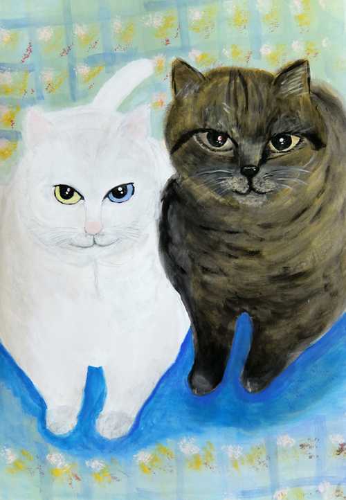KONさんの新作は彼女が以前飼っていた(家族として一緒に住んでいた)2匹の猫です。名前も教えてくれていましたが、忘れてしまいました。ごめんなさい。 とてもリアルに表現した猫たちです。リアルといってもただ写真を見るような表面的なリアルさだけではないことを感じます。2匹の猫がじっとこっちを見て、何かを訴えかけてくるリアルさがあります。思わず声をかけたくなるようなリアルさです。私は「いつごはんくれるんだい?」といった現実的な訴えしか浮かびませんが、飼い主であったKONさんはもっと別の訴えが聞こえてくるのでしょう。 絵画の中で特に写実絵画に当てはまることなのですが、写真のようにとても細かいところまでリアルを追求するスーパーリアリズム(フォトリアリズムともいいます)というのがあります。ルネサンス期から西洋絵画で芸術家たちが何処までリアルに表現できるかを追求してきました。19世紀後半に写真という技術が生まれ、その写真に負けないようなリアリズムをある芸術家たちが求めました。それが20世紀半ばに誕生したスーパーリアリズムです。鑑賞者はそれらの作品を見てあっと驚きました。写真と変わらない技術に驚いたわけです。ところが何か足りないモノがあると気づいたのも芸術家たちでした。それは作品の中に見られる心、或いは精神性は何処にあるんだろう?と言うことでした。逆に芸術家たちが現代の空虚感とか何か空しさを感じていれば、スーパーリアリズムは的確な表現方法かもしれません。でも芸術家たちはそのことだけを求めているだけではありません。多くの芸術家たちは自分の存在、そして存在することの身体性と精神性を表現に求めました。その尤もたるところが作家自身の心の在り方でした。簡単に言うと喜怒哀楽も作品に表現できないか。その喜怒哀楽という心で感じるモノを絵画にどうやって見せられるかということです。この課題は今でも多くの芸術家たちは追求しています。 KONさんのこの新作はリアルに猫を表現しました。2匹の猫からリアル以上のリアルさを感じます。それはKONさんの心をこの絵の中に感じるからでしょう。こうすれば絵の中に心が表現できるという方程式はありません。ただKONさんが何処まで猫たちを愛していたか、愛おしく思っていたか、制作中ずっと感じながら描いていたことが一番なのかなと思います。 白い猫の目が左右色を変えています。片方が青い目に変化しているのは耳が聞こえないということから色が変わるらしいです。KONさんが絵を面白くするために色を変えたということではないということでした。でもこの2匹の眼力は凄いですね! 圧倒されました! 頑張りました、KONさん。
