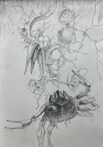 濵田さんの新作はデッサンです。 デッサンというと習作のイメージですが、一つの作品として成り立たせるためには、制作者のしっかりとした思い、考えが画面に見えてこないと習作としての作品とはなりません。 濵田さんの新作はデッサンとしても完成されているとは言いがたいと思います。ところがこの作品から見えるのは濵田さん自身が何を見ようとしているのか、何を求めて表現しようとしているのか、かなりはっきりと見えています。具体的な対象物を画面の上に正確に表現しようとすることだけがデッサンの役目ではありません。描く対象物を前にしてそれを写し取りながら、その中に作者自身が何を見ようとしているのか、何を求めているのか自分自身の心の中を探索し、自分自身の心の内を把握することがデッサン、スタヂィの大きな役目です。つまりデッサンは対象物を描きながら、その中に自分自身の心を見つめ、己を振り返り、自分の心を正面から掴み取る作業です。 ピカソ、マティス、ダ・ヴィンチ、ミケランジェロなど美術史の巨匠たちもたくさんデッサンをしています。それらのデッサンを見れば分かりますが、写真のように正確なデッサンとは言いがたいかもしれません。でも彼らが何を見ようとしたのか、彼らの心の中で何を求めていたのか、はっきりと見えてくるのが彼らのデッサンです。制作者は常に自分自身と対話をします。そして様々なアプローチを試しながら自分自身が本当に求めるモノとは何なのかを探っていきます。 この作品の中で濵田さんは自分自身が求めているモノは何なのか?そして分からないと感じながら手探りで必死に自分自身の心と向き合おうとしていることが見えます。 作品には鳥の嘴、蟹と全く関係ないような2つの対象物が見られます。でもこれらは濵田さんにとってとても大事な描く対象物なのでしょう。その全く違ったモノを濵田さんは必死にシンクロさせようとしてるのです。最後の完成の域まで入っていません。でも濵田さんが自分の心と向き合って取り組んだ表現には大きなパワーを感じます。濵田さん、よく頑張りました。