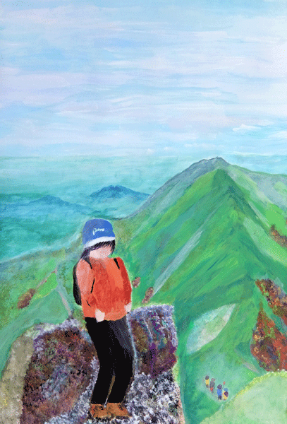 KONさんの新作は友人が四国の剣山に登山に行った時に撮った写真を基に表現しています。剣山の頂上に向かう山の尾根を背景にしたのでしょうか?とても爽やかでスケールの大きな山の自然を感じます。 空から山の尾根に向けての景色を淡い色のグラデーションが自然の壮大さと空気感を見事に捉えています。遠くに見える山々を消え入るようなタッチでぼかしを入れて描いているのはとても良かったなと思います。 KONさんの友人は頂上に向かう途中で一息入れて記念写真を撮ったのでしょうか。なぜか少し疲れたような、あるいはこれからもう少し頑張るぞという雰囲気にも見えます。私がそのような雰囲気に見えると言ったのは、友人の姿に細かいディテール、(顔の目、鼻、口など、また服のシワとか影など)が描かれていず、鑑賞者がここに佇む主人公の姿を見て、ある程度の想像力を働かしてどのような感じなのか判断することが前提にある作品かなと思ったからです。人物を描くとき、目、鼻、口を含めてすべての部位をしっかり描くことも大事かと思いますが、逆に目、鼻、口を描かなくても、身体全体の流れ、仕草を見せることによって、その人物の雰囲気をより強く鑑賞者に感じさせることも可能です。こういった技法を20世紀の巨匠である画家、アンリ・マティスはたびたび使用していました。細かいディテールを省いて大きな流れを最大限に生かすという方法です。 画面右下の4人の登山者も描かれていますが、KONさんはその4人に対してもかなりあっさりと表現しています。でもそれだけでも4人は歩いていることもわかるし、何故か頑張っている雰囲気は伝わってきます。 KONさんの作品に対する意識は、人物を正確に表現することではなく、その人物の登山に対して情熱を傾けている雰囲気を表現したかったのでしょう。その主人公である友人と壮大な山の自然が細かいディテールを省くことによって、うまく絡み合って、画面に統一感をもたらしたようにも感じました。 またKONさんは遠くに見える風景と近くに見える風景に対して色の強さに変化を加えることで遠近感を感じさせようとしているのでしょう。とても難しい方法にアプローチしているのにはびっくりしました。よく頑張りました。