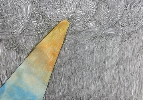 徳弘さんの新作はペンと水彩絵の具を使っています。 ペンは色でいうと黒い線が見えます。そしてその黒い線はかなり堅く強く表現されます。逆に水彩絵の具の表現は支持体である紙の中に絵の具が染み込んでいくことで柔らかいイメージが現れてきます。 徳弘さんはその堅い、柔らかい、そして白黒、色彩といった対極にある視覚表現を一つの画面のなかでどうすれば上手く組み合わせることができるか実験してるようです。 そして徳弘さんは自然の中で見られるどんよりとした曇り空と厚い雲の僅かの隙間から差し込んでくる明るい太陽の光の筋を組み合わせれば頭の中で描いたコントラストが上手く表現できるのではと考えたようです。 そしてとても力強いインパクトの強い作品に仕上がったと思います。 太陽からの光線を画面の中央から少し左寄りから左下方向に斜めに運んだことも良かったと思います。平面作品を制作する中でシンプルな構図を組み立てるとき、画面中央からシンメトリー(左右対称)に表現しようとしがちになります。一番バランスがとれて、正面から向き合う簡単な構図になりますが、そうすると画面の流れが不思議と止まってしまいます。画面のシンメトリー(左右対称)を崩すことによって画面の中に流れとか動きを創ることが生まれてきます。徳弘さんはそういったことをこの制作を通して学んだように思います。平面制作する上でとても大事なことだと思います。 私がもう1点、徳弘さんの制作を見てとても感心したことがあります。それはペンから生み出された黒い線です。徳弘さんは全てフリーハンドでこの作品を描きました。 描いているペンの線は何万という数になります。全て1本ずつ彼女が他の道具を使わず、自分自身の手で描いています。多分彼女は丁寧に1本ずつ正確に描こうとしたのでしょう。でも人間の手で描いているわけですから、全体を見ると微妙に線にズレが見られます。そのズレが逆に画面の中に面白い線の模様として見られます。機械(先端的な道具)で線を描くと、このような微妙なズレはできず、全てが均一化されたイメージになってしまいます。制作する中で、人間の持つ温かみとか柔らかさは機械に頼るのではなく人の手が織りなすパワーだと思います。それは太陽の光にあるグラデーションにも同じことが言えるでしょう。自分の手による表現の醍醐味ですね。人間って凄いなあと感じさせてくれる表現ですね。 徳弘さんはこれからどんどんと新しい作品を創っていくと思いますが、新しい発見と驚きを感じながら制作してほしいと思っています。 よく頑張りました、徳弘さん!